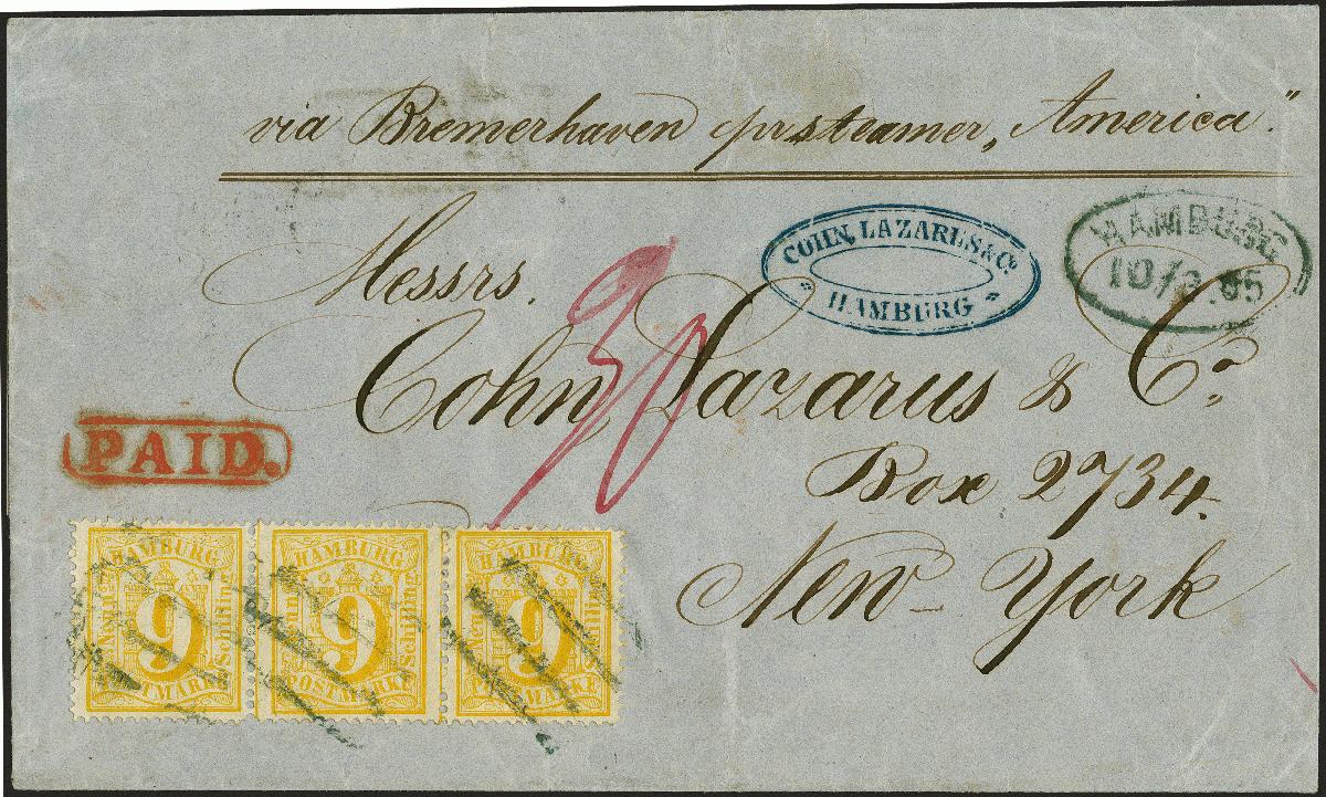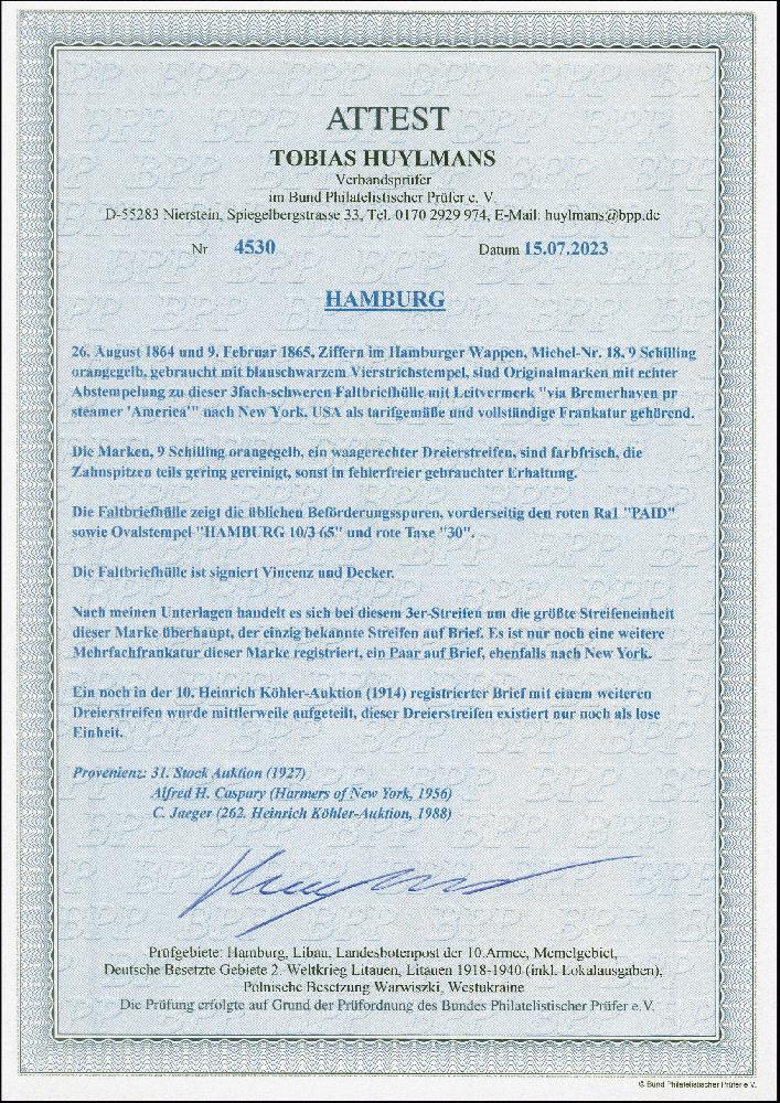 | Zusatzinformationen und Suchstichworte: | 382. Auktion Heinrich Köhler 18. – 23. September 2023 Los 92 9 Schilling gelborange im waagerechten 3er-Streifen, sehr schön farbfrisch und einwandfrei gezähnt, mit sauber aufgesetzten dicken Strichstempeln und nebengesetztem Ovalstempel "HAMBURG 10/3 65" auf Briefhülle der 3.Gewichtsstufe mit Leitvermerk "via Bremerhaven pr Streamer 'Amerika'", nach New York. Einige Zahnspitzen leicht gereinigt, sonst tadellose und frische Erhaltung. Eine der großen Seltenheiten der Hamburg-Philatelie. Es ist überhaupt nur noch eine weitere Mehrfachfrankatur dieser Marke registriert (ein Paar auf Brief nach New York); dies ist die größte bekannte gebrauchte Einheit der 9 Schilling gezähnt und auf Brief ein Unikat. Eines der bedeutendsten Stücke der norddeutschen Staaten. Signiert Vicenz und Decker, Fotoattest Huylmans BPP (2023) Ausruf 40.000,00 EUR |