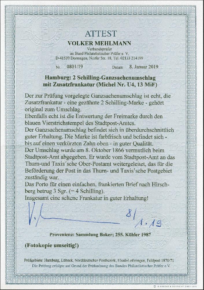 | Zusatzinformationen und Suchstichworte: | 382. Auktion Heinrich Köhler 18. – 23. September 2023 Los 96 1866, Umschlag 2 Schilling rotorange mit Absender-Prägestempel, mit wertstufengleicher Zusatzfrankatur 2 Schilling rot, entwertet durch blauem Balkenstempel des Stadtpostamtes und mit nebengesetztem Taxis-Einkreisstempel "HAMBURG TH.&T. 8/10" nach Hirschberg mit rückseitigem Thurn and Taxis- Stempel "HIRSCHBERG BEI SCHLEIZ 10/10/1866". Bis auf einen verkürzten Zahn der Zufrankatur, in guter Erhaltung. Ein ungewöhnliches Stück. Fotoattest Mehlmann BPP (2019) Ausruf 500,00 EUR |