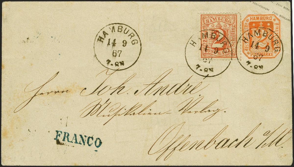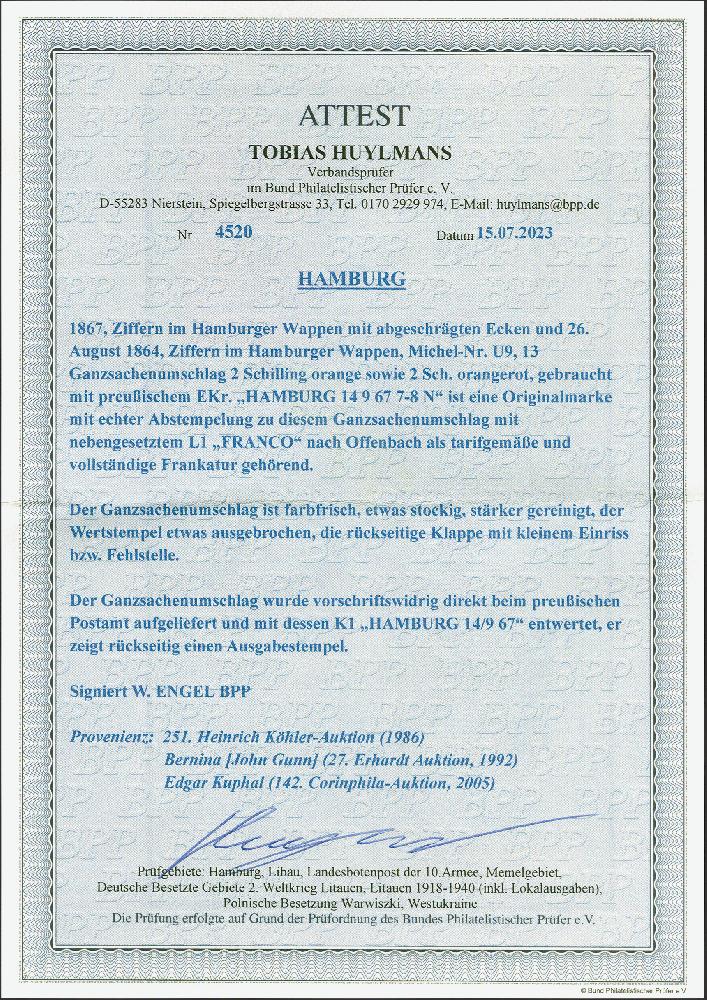 | Zusatzinformationen und Suchstichworte: | 382. Auktion Heinrich Köhler 18. – 23. September 2023 Los 97 1867, Umschlag 2 Schilling rotorange mit Wasserzeichen, mit wertstufengleicher Zusatzfrankatur 2 Schilling rot, mit sauber auf- und nebengesetztem preußischen Einkreisstempel "HAMBURG 14 9 67" nach Offenbach. Der Wertstempel ist gebrochen, die Ganzsache etwas gereinigt, sonst bis auf übliche kleine Spuren einwandfrei. Ein ungewöhnliches Stück mit vorschriftswidriger und unbeanstandeter direkter Aufgabe beim preußischen Postamt. Signiert Engel BPP und Fotoattest Huylmans BPP (2023) Ausruf 500,00 EUR |