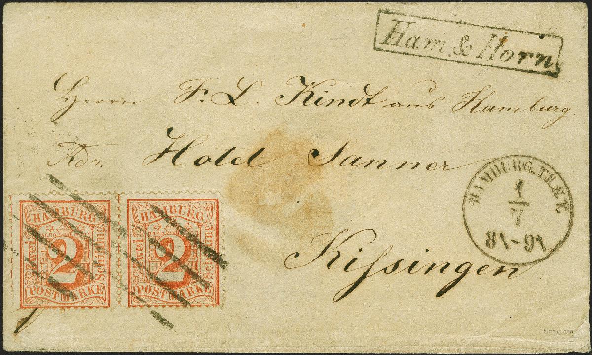 | Zusatzinformationen und Suchstichworte: | 382. Auktion Heinrich Köhler 18. – 23. September 2023 Los 99 1857, "HAM & HORN", Rahmenstempel, sauber abgeschlagen auf Briefkuvert, frankiert mit waagerechtem Paar 2 Schilling orangerot, farbfrisch und gut gezähnt, entwertet durch Balkenstempel, mit nebengesetztem Taxis-Einkreisstempel "HAMBURG TH.&T. 1/7" nach Kissingen mit Ankunftsstempel. Kleiner Siegelfleck durchschlagend, die Frankatur war gelöst und gereinigt, sonst einwandfrei. Signiert Kruschel und Pfenninger, Fotoattest Huylmans BPP (2023) Ausruf 500,00 EUR |