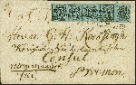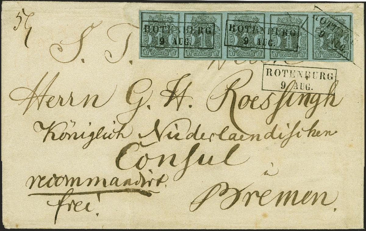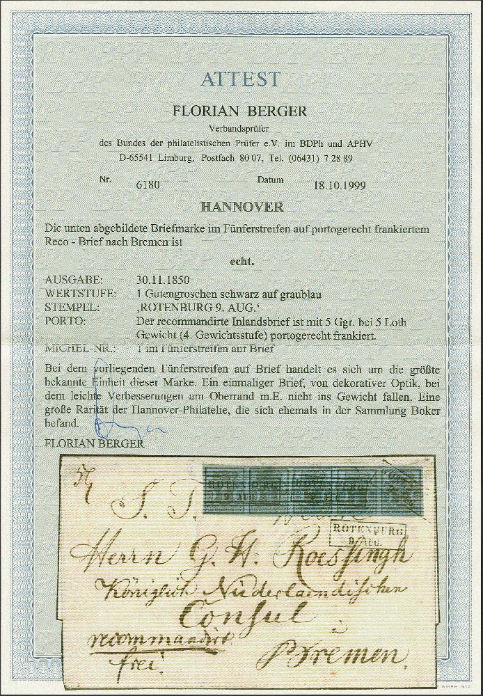 | Zusatzinformationen und Suchstichworte: | 382. Auktion Heinrich Köhler 18. – 23. September 2023 Los 102 1850, 1 Gutegroschen auf graublau, waagerechter 5er-Streifen, sehr schön farbfrisch und allseits breitrandig, mit sauber auf- und nebengesetztem schwarzem Rahmenstempel "ROTENBURG 9 AUG." auf rekommandierter Briefhülle der 4. Gewichtsstufe (4 bis unter 8 Loth) an den königlich niederländischen Konsul Gerhard Heinrich Roessingh in Bremen, mit Ankunftsstempel vom folgenden Tag. Im oberen Bereich des Streifen schwache waagerechte Bugspur sowie oben an einigen Stellen geringe und unmerkliche Korrekturen, sonst einwandfreie und ursprüngliche Erhaltung . Dies ist die größte bekannte Einheit der Nr. 1 von Hannover und als solche ein Unikat. Ein Spitzenstück der Altdeutschland-Philatelie. Signiert Kleeberg, Fotoattest Berger BPP (1999) Ausruf 60.000,00 EUR |