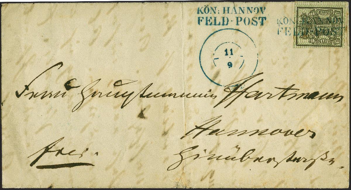 | Zusatzinformationen und Suchstichworte: | 382. Auktion Heinrich Köhler 18. – 23. September 2023 Los 108 1 Gutegroschen schwarz, grün genetzt, mit rechtem Bogenrand und Randnummer »7« (um den Briefrand geklebt), mit sauber auf- und nebengesetztem blauen Langstempel "KÖN:HANNOV./FELD-POST" auf Brief mit nebengesetztem Doppelkreisstempel "11/9" ohne Ortsangabe nach Hannover. Der Brief ist innen datiert "Nordstemmen, 11.9.58". Der bereits 1849 in Schleswig-Holstein benutzte Stempel kam anläßlich einer Truppenübung des 10. Deutschen Bundescorps 1858 in der Gegend von Nordstemmen in Verwendung und ist auf frankierten Briefen außerordentlich selten; wir haben nur 2 weitere registriert. Ausruf 5.000,00 EUR |