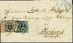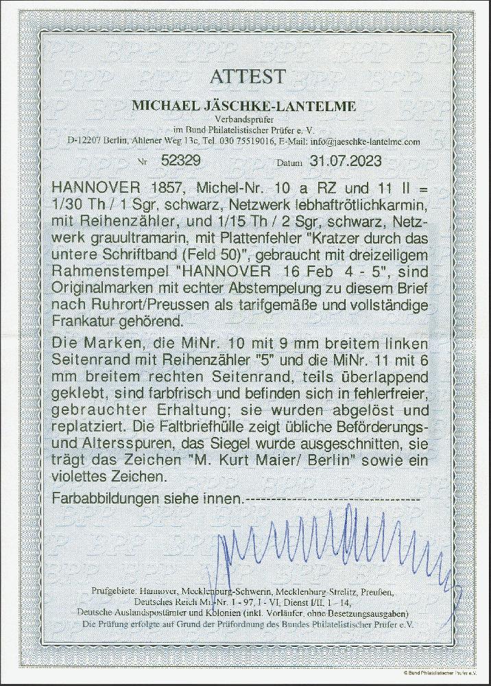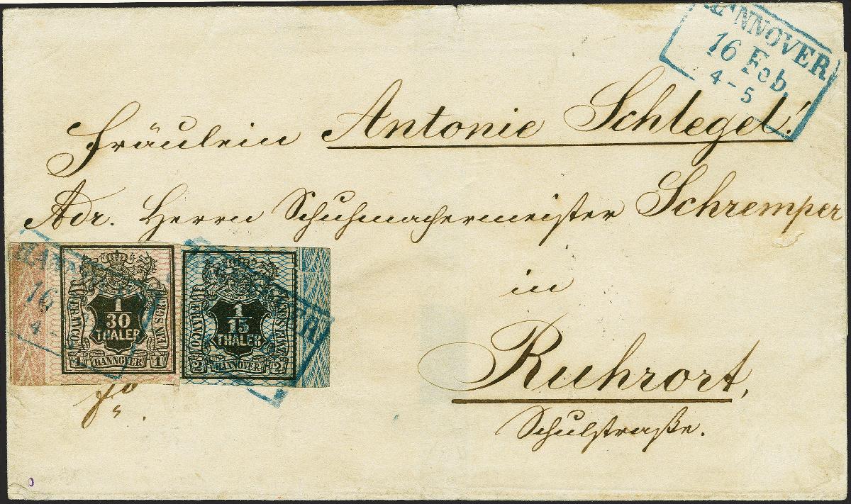 | Zusatzinformationen und Suchstichworte: | 382. Auktion Heinrich Köhler 18. – 23. September 2023 Los 113 1/30 Thaler schwarz, rosa genetzt, linkes Randstück mit Reihenzähler "5", und 1/15 Thaler schwarz, blau genetzt, rechtes Randstück ohne Reihenzähler, mit Plattenfehler 'Kratzer durch das untere Schriftband' von Feld 50, mit sauber auf- und nebengesetztem Rahmenstempel "HANNOVER 16 Feb." auf Briefhülle nach Ruhrort. Die Marken waren zur Kontrolle gelöst, die Hülle übliche leichte Beförderungspuren, sonst einwandfrei. Eine in dieser Form ganz außergewöhnliche Farbfrankatur. Signiert Kurt Maier, Berlin, Fotoattest Jäschke-L. BPP (2023) Ausruf 1.000,00 EUR |