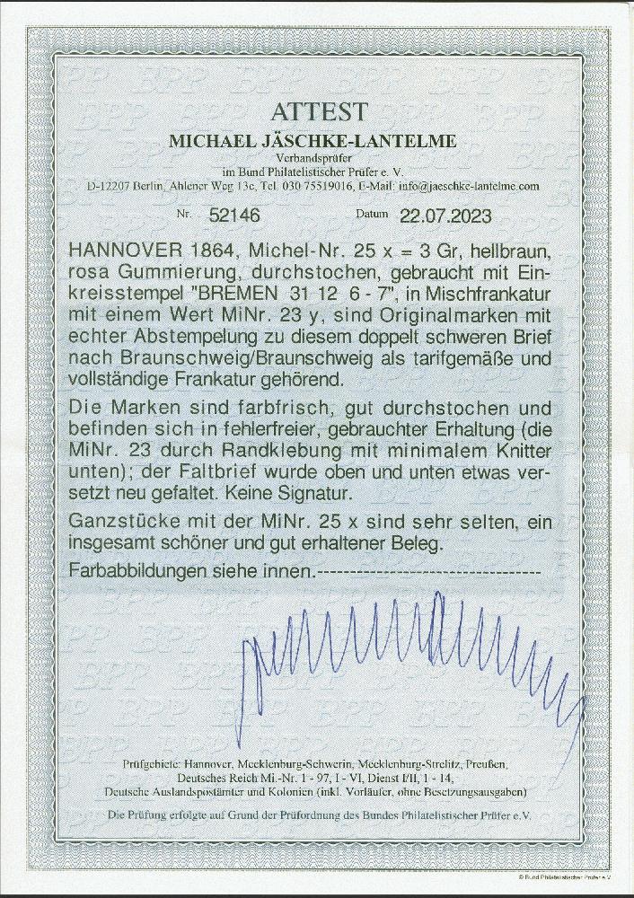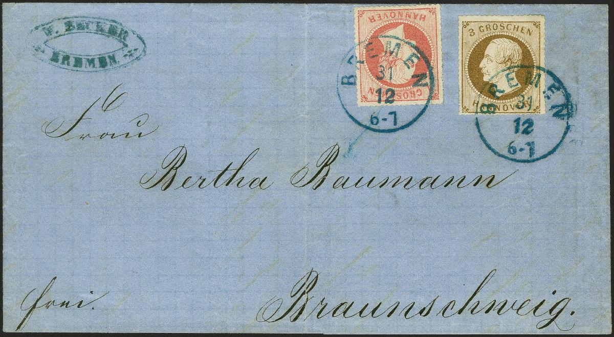 | Zusatzinformationen und Suchstichworte: | 382. Auktion Heinrich Köhler 18. – 23. September 2023 Los 115 3 Groschen braun, rosa Gummierung, zusammen mit 1 Groschen rosa, weiße Gummierung, beide farbfrisch und gut durchstochen, mit Einkreisstempel "BREMEN 31 12" auf Faltbrief nach Braunschweig. Sehr schöne und einwandfreie Erhaltung (die 1 Groschen durch Randklebung minimale Knitter). Eine der größten Brief-Raritäten von Hannover. Fotoattest Jäschke-L. BPP (2023) Ausruf 3.000,00 EUR |