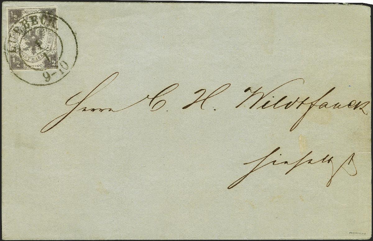 | Zusatzinformationen und Suchstichworte: | 382. Auktion Heinrich Köhler 18. – 23. September 2023 Los 117 ½ Schilling dunkelviolettgrau, tiefe Farbe, links in der Randlinie minimal berührt, sonst voll- bis breitrandig, mit klarem Doppelkreisstempel. "LUEBECK 1/1" auf Ortsbriefhülle. Schöne und sonst einwandfreie Erhaltung. Da die Ortsstempel-Entwertung nur vom 1.1.- 3.3.1859 vorgeschrieben war, handelt es sich hier mit einiger Wahrscheinlichkeit um einen Ersttagsbrief. Ein attraktives Stück. Signiert Pfenninger, Fotoattest Heitmann BPP (2023) Ausruf 2.000,00 EUR |