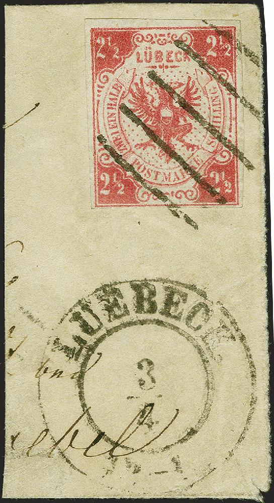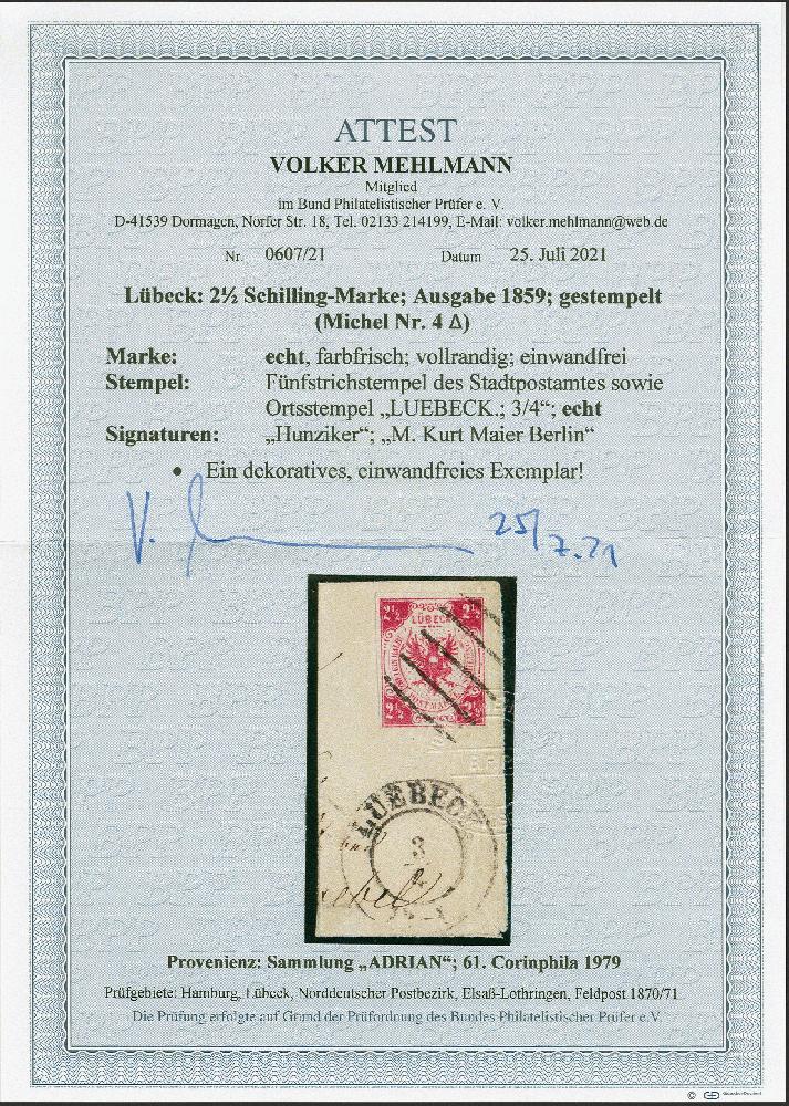 | Zusatzinformationen und Suchstichworte: | 382. Auktion Heinrich Köhler 18. – 23. September 2023 Los 120 2½ Schilling mittelmagenta, sehr schön farbfrisch und gut voll- bis sehr breitrandig, mit sauber aufgesetztem Strichstempel und nebengesetztem Doppelkreisstempel "LÜBECK 3/4" auf größerem Briefstück. Sehr schöne und tadellose Erhaltung. Signiert Hunziker und Kurt Meyer, Fotoatteste Mehlmann BPP (2021) und Heitmann BPP (2023) Ausruf 300,00 EUR |