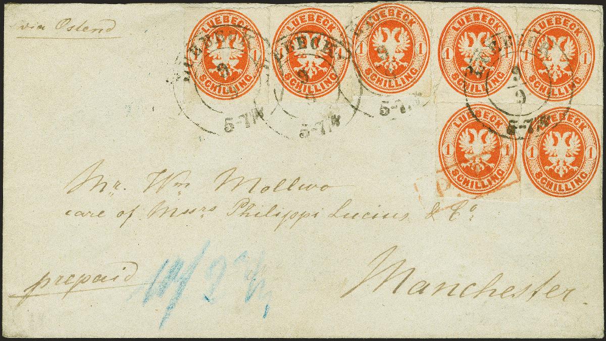 | Zusatzinformationen und Suchstichworte: | 382. Auktion Heinrich Köhler 18. – 23. September 2023 Los 123 1 Schilling rötlichorange, 7 Einzelwerte, alle farbfrisch, mit mehrfach sauber aufgesetztem Doppelkreisstempel "LUEBECK 9/9" (1867) als portogerechte 7 Schilling-Frankatur auf Briefkuvert nach Manchester, mit ausgewiesenem Weiterfranko von 2½ Silbergroschen. Der linke untere Wert unauffällig gering fehlerhaft (dieser mit zusätzlichem roten Rahmenstempel "P.D."), sonst tadellos. Eine äußerst attraktive und außerordentlich seltene 'Massenfrankatur'. Fotoattest Heitmann BPP (2023) Ausruf 5.000,00 EUR |