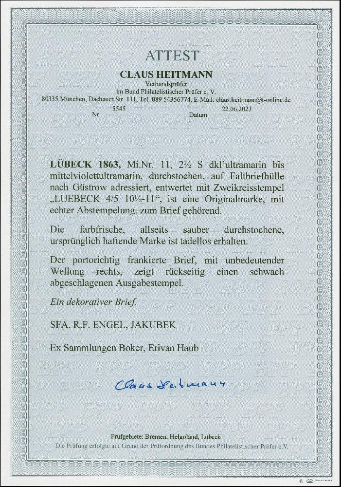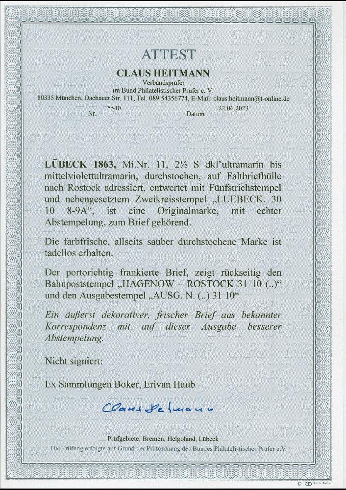 | Zusatzinformationen und Suchstichworte: | 382. Auktion Heinrich Köhler 18. – 23. September 2023 Los 126 2½ Schilling ultramarin, 3 Einzelfrankaturen nach Mecklenburg, dabei die Marken mit unterschiedlichen Entwertungen durch "L" im Kreis, Strichstempel, bzw. Doppelkreisstempel. Alle Werte farbfrisch und bis auf einem kleinen Durchstichmangel bei der Marke mit "L"-Entwertung einwandfrei erhalten. Ein sehr schönes und seltenes Ensemble. Jeder Brief Fotoattest Heitmann BPP (2023) Ausruf 1.000,00 EUR |