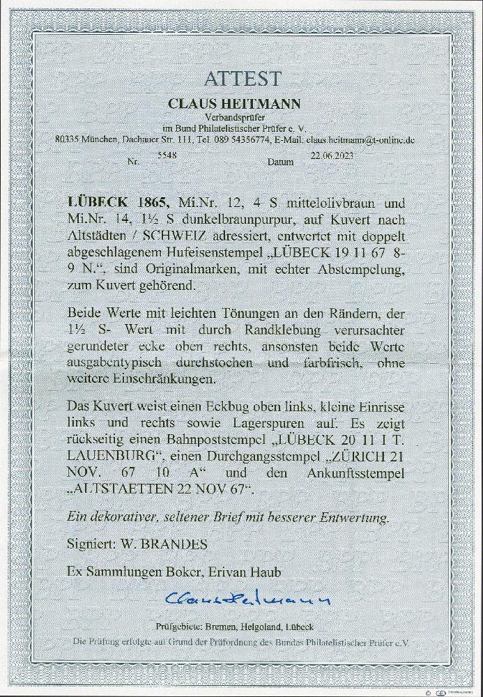 | Zusatzinformationen und Suchstichworte: | 382. Auktion Heinrich Köhler 18. – 23. September 2023 Los 128 1½ Schilling violett und 4 Schilling hellbraun, beide sehr schön farbfrisch (minimale Randtönungen), mit jeweils klar aufgesetztem Hufeisenstempel "LÜBECK 19 11 67" auf Briefkuvert nach Altstädten im schweizer Kanton St. Gallen, mit rückseitigem Bahnpoststempel "LÜBECK/LAUENBURG" und Ankunftsstempel. Die 1½ Schilling oben rechts durch Randklebung minimal eckrund, sonst einwandfrei. Ein ebenso attraktiver wie seltener Auslandsbrief. Signiert Brandes, Fotoattest Heitmann BPP (2023) Ausruf 1.500,00 EUR |