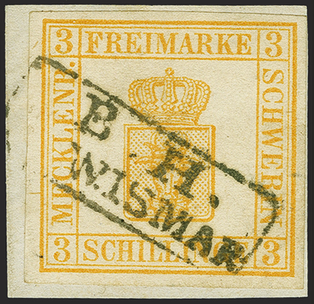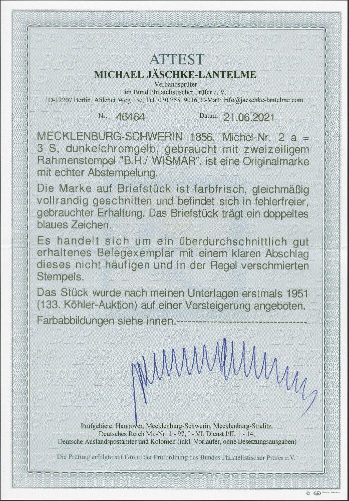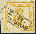 | Zusatzinformationen und Suchstichworte: | 382. Auktion Heinrich Köhler 18. – 23. September 2023 Los 130 1856,3 Schilling dunkelchromgelb, farbfrisch und voll- bis breitrandig, mit besonders klar aufgesetztem kleinen Rahmenstempel "B. H. WISMAR" auf Briefstück. Tadellos. Fotoattest Jäschke-L. BPP (2021) Ausruf 100,00 EUR |