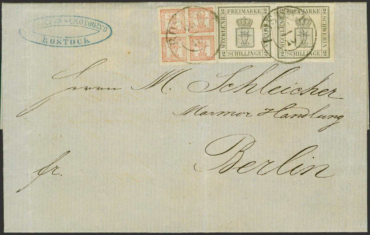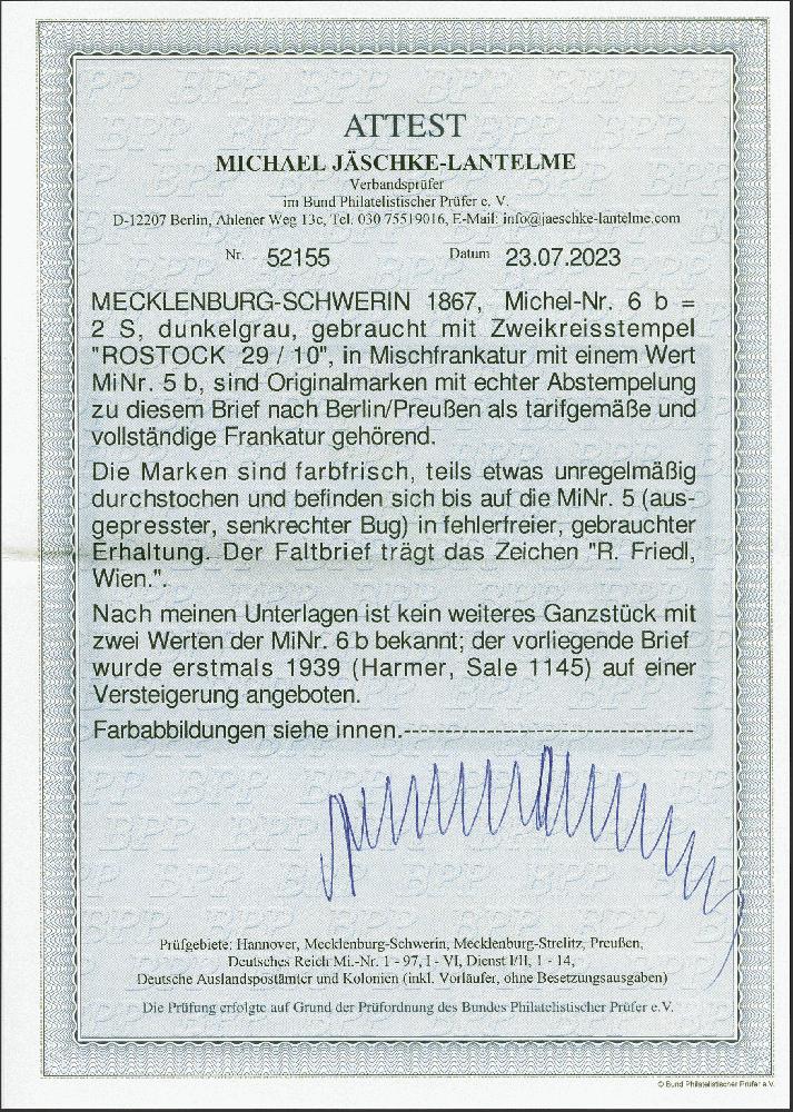 | Zusatzinformationen und Suchstichworte: | 382. Auktion Heinrich Köhler 18. – 23. September 2023 Los 137 2 Schilling dunkelgrau, 2 Einzelwerte, zusammen mit 4/4 Schilling lebhaftbräunlichrot auf gewöhnlichem Papier, alle farbfrisch und üblich, teils etwas unregelmäßig durchstochen, mit leicht aufgesetztem Doppelkreisstempel "ROSTOCK 29/10" (1867) auf komplettem Faltbrief nach Berlin. Durch die 4/4 Schilling verläuft eine unauffällige senkrechte Bugspur, sonst einwandfreie und sehr schöne Erhaltung. Die 2 Schilling dunkelgrau gehört auf Brief zu den großen Altdeutschland-Seltenheiten; es ist kein weiteres Ganzstück mit 2 Exemplaren der seltenen Farbe bekannt. Signiert Friedl, Wien und Fotoattest Jäschke-L. BPP (2023) Ausruf 20.000,00 EUR |