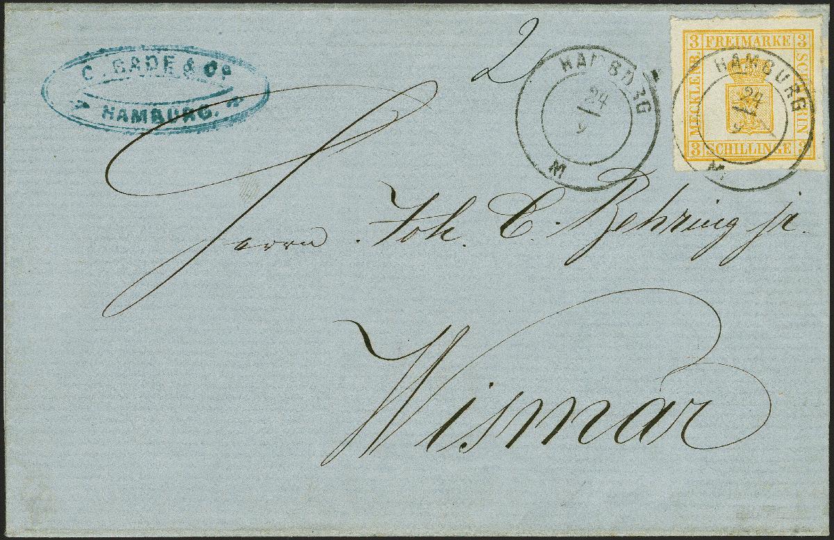 | Zusatzinformationen und Suchstichworte: | 382. Auktion Heinrich Köhler 18. – 23. September 2023 Los 138 3 Schilling gelb, breiter Rand, farbfrisch und gut durchstochen, mit klar auf- und nebengesetztem Doppelkreisstempel "HAMBURG 24/9" auf Briefhülle nach Wismar. Kleiner Stockfleck abgeschwächt, sonst tadellos. Fotoattest Jäschke-L. BPP (2023) Ausruf 200,00 EUR |