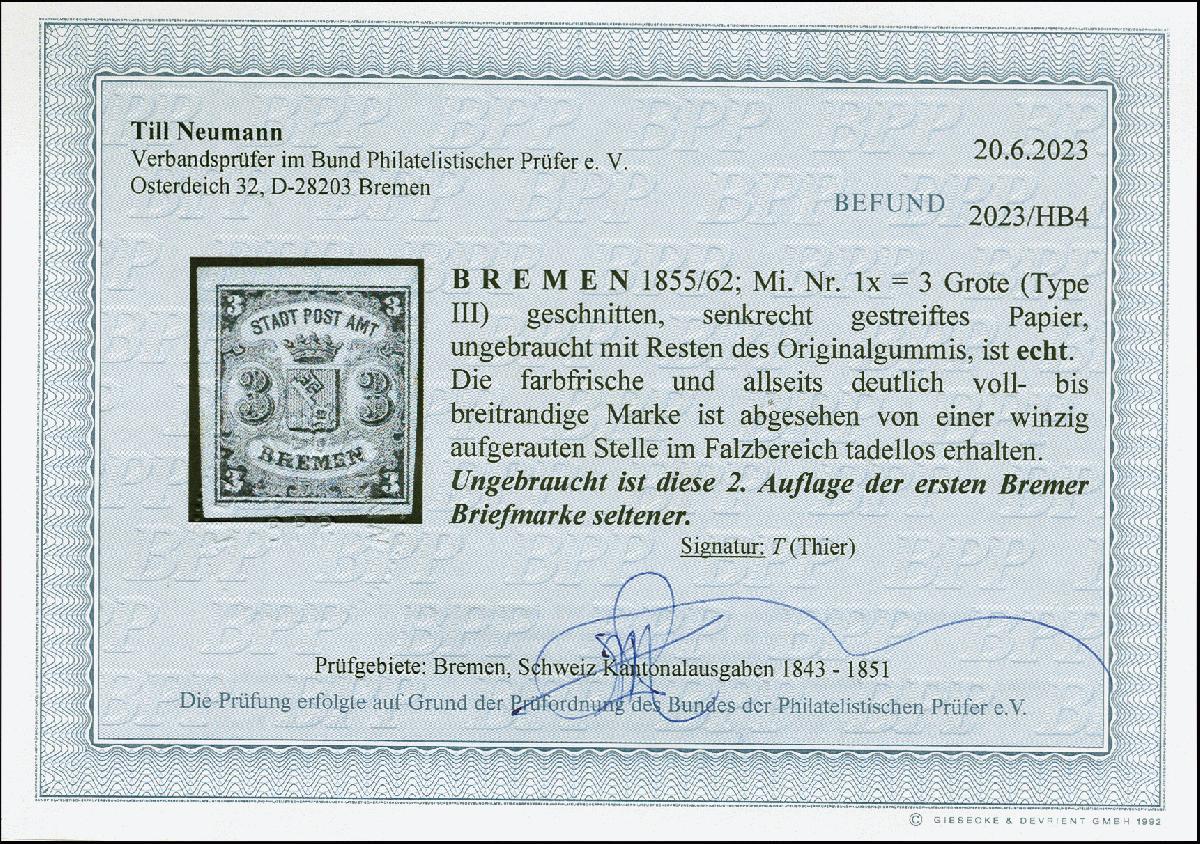 | Zusatzinformationen und Suchstichworte: | 382. Auktion Heinrich Köhler 18. – 23. September 2023 Los 9001 1855/62, 3 Grote auf blaugrau, geschnitten, Type III, senkrecht gestreiftes Papier, allseits breitrandig, ungebraucht mit Gummiresten. Minimal falzhell, ansonsten einwandfreie Erhaltung. Eine seltene Marke. Signiert Thier und Fotobefund Neumann BPP (2023) Ausruf 100,00 EUR |