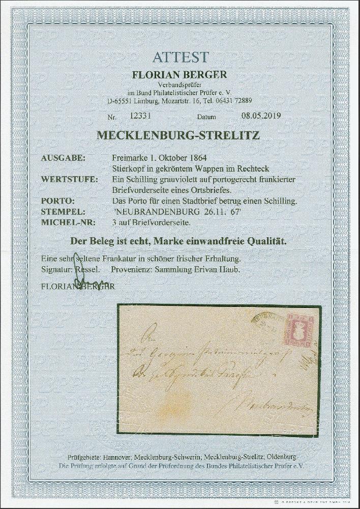 | Zusatzinformationen und Suchstichworte: | 382. Auktion Heinrich Köhler 18. – 23. September 2023 Los 146 1 Schilling grauviolett, farbfrisch und mit sehr schöner Prägung, einwandfrei durchstochen, mit sauber aufgesetztem Segmentstempel "NEUBRANDENBURG 26-11-67" auf Briefvorderseite eines Ortsbriefes. Ganz geringe Patina, sonst tadellos. Ein sehr attraktives Stück. Signiert Ressel und Fotoattest Berger BPP (2019) Ausruf 2.000,00 EUR |