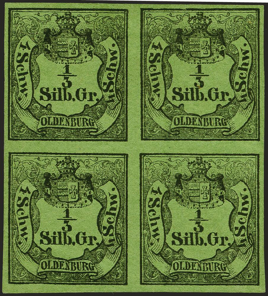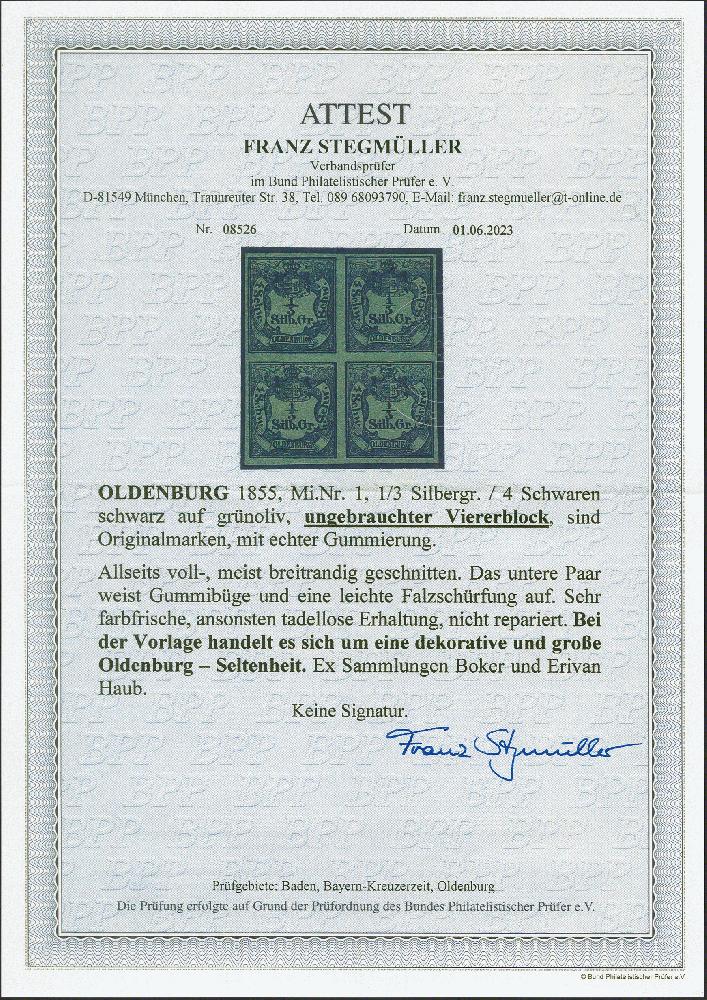 | Zusatzinformationen und Suchstichworte: | 382. Auktion Heinrich Köhler 18. – 23. September 2023 Los 149 ⅓ Silbergroschen schwarz auf grün im Viererblock, sehr schöne frische Farbe und allseits voll- bis meist breitrandig, ungebraucht mit Originalgummi. Das untere Paar weist Gummibüge und eine leichte Falzschürfung auf, sonst tadellose und sehr frische Erhaltung. Eine sehr seltene und attraktive Einheit. Fotoattest Stegmüller BPP (2023) Ausruf 5.000,00 EUR |