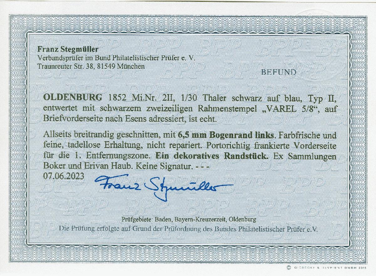 | Zusatzinformationen und Suchstichworte: | 382. Auktion Heinrich Köhler 18. – 23. September 2023 Los 151 1/30 Thaler schwarz auf blau, Type II, allseits breitrandiges linkes Randstück mit ca. 6,5 mm Bogenrand, mit sauber auf- und nebengesetztem schwarzen Rahmenstempel "VAREL 5/8" auf Briefvorderseite mit Teil einer Rückklappe nach Esens mit Ankunftsstempel. Ein schönes Stück in einwandfreier Erhaltung. Fotobefund Stegmüller BPP (2023) Ausruf 150,00 EUR |