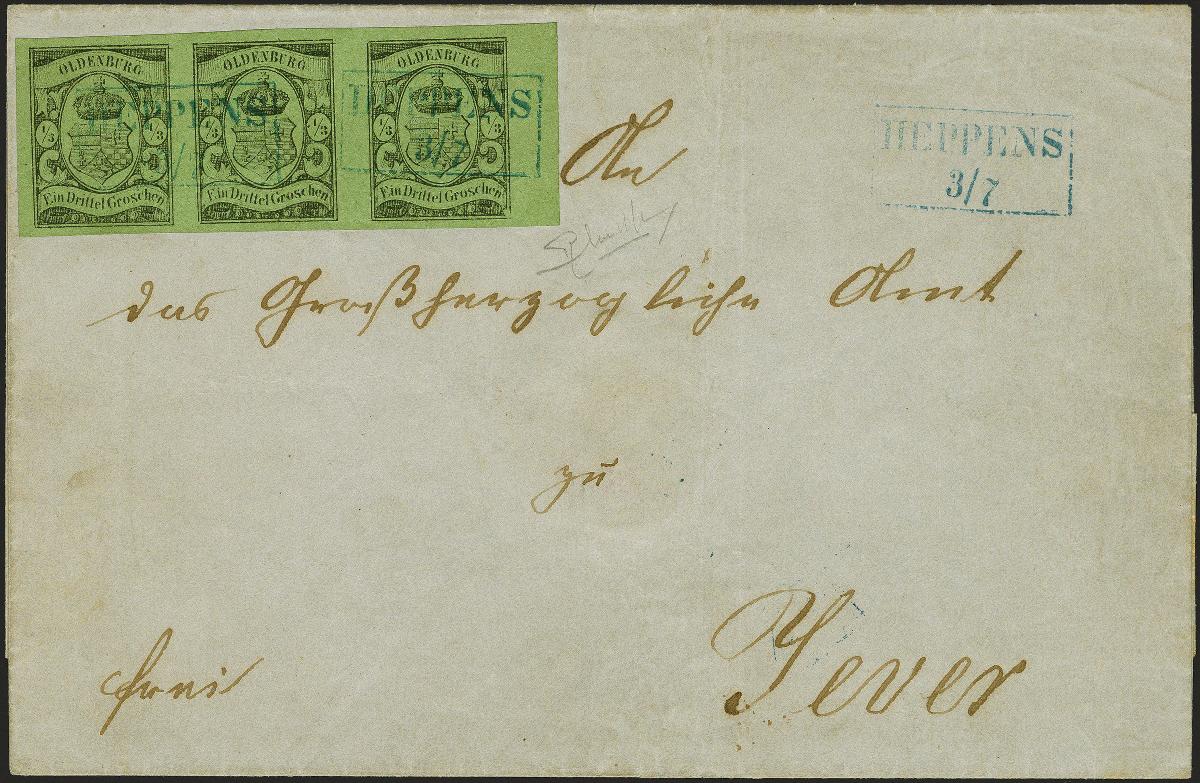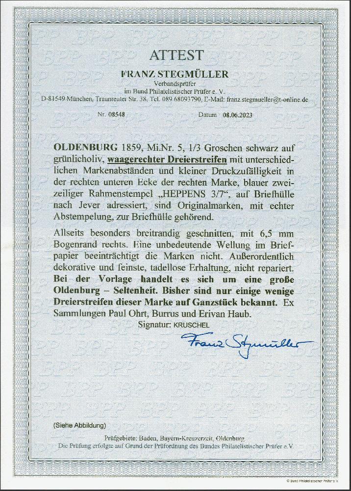 | Zusatzinformationen und Suchstichworte: | 382. Auktion Heinrich Köhler 18. – 23. September 2023 Los 156 ⅓ Groschen schwarz auf grün im waagerechten Dreierstreifen mit unterschiedlichen Markenabständen, wundervoll farbfrisch und allseits besonders breitrandig, rechts mit ca. 6,5 mm Bogenrand, mit leicht auf- und nebengesetztem blauen Rahmenstempel "HEPPENS 3/7" auf Briefhülle nach Jever mit Ankunftsstempel. Besonders schöne, frische und tadellose Erhaltung (eine unbedeutende Wellung im Briefpapier beeinträchtigt die Marken nicht). Ein phantastisches Stück; zweifellos der schönste Streifen dieser Marke und auf Brief von großer Seltenheit. Signiert Kruschel und Fotoattest Stegmüller BPP (2023) Ausruf 30.000,00 EUR |