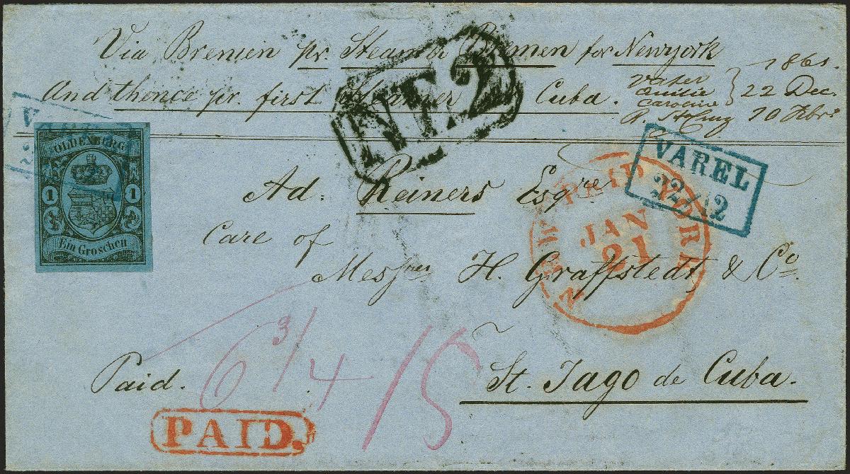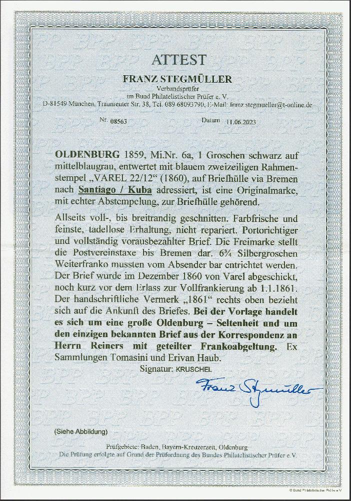 | Zusatzinformationen und Suchstichworte: | 382. Auktion Heinrich Köhler 18. – 23. September 2023 Los 159 1 Groschen schwarz auf blau, farbfrisch und voll- bis breitrandig, mit sauber auf- und nebengesetztem Rahmenstempel "VAREL 22/12"(1860) auf Briefhülle über Bremen und New York nach Santiago de Cuba. Der Brief war mit 7 ¾ Groschen voll bezahlt, davon jedoch nur die Vereinstaxe frankiert, das Weiterfranko in Höhe von 6 ¾ Groschen bar entrichtet und vorderseitig notiert. Sehr schöne und einwandfreie Erhaltung. Einzig registrierter Brief Oldenburgs mit 'geteiltem Franko' über Bremen nach Kuba. Fotoattest Stegmüller BPP (2023) Ausruf 3.000,00 EUR |