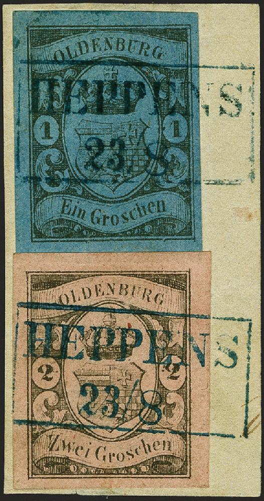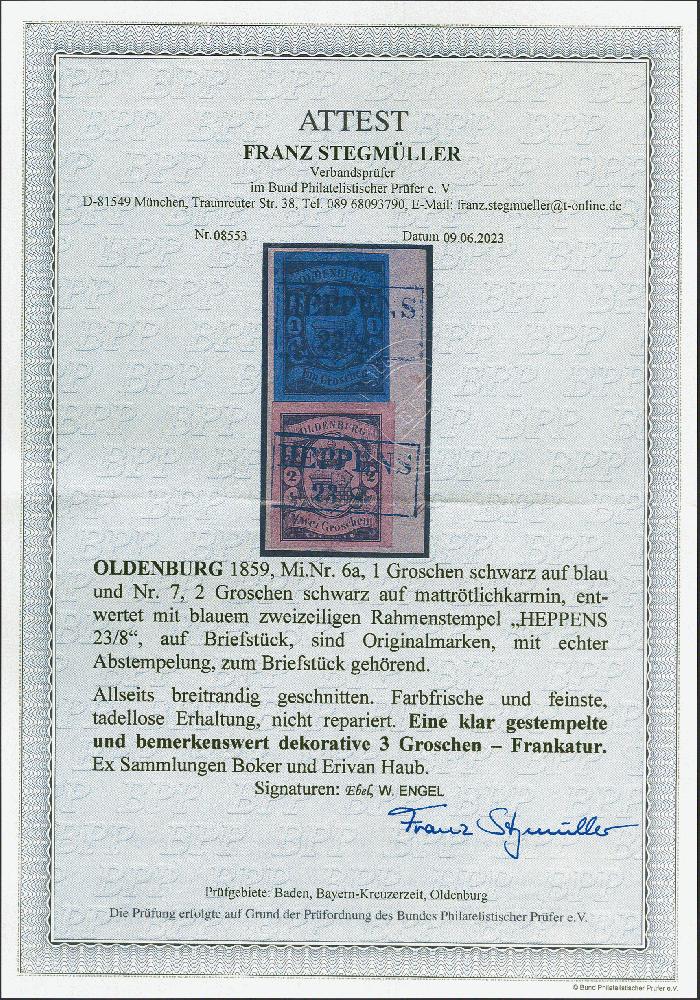 | Zusatzinformationen und Suchstichworte: | 382. Auktion Heinrich Köhler 18. – 23. September 2023 Los 160 1 Groschen schwarz auf blau und 2 Groschen schwarz auf mattrötlichkarmin, beide farbfrisch und voll- bis meist breitrandig, mit jeweils sauber aufgesetztem Rahmenstempel "HEPPENS 23/8" auf Briefstück. Schöne und tadellose Erhaltung. Signiert Ebel und W. Engel, Fotoattest Stegmüller BPP (2023) Ausruf 500,00 EUR |