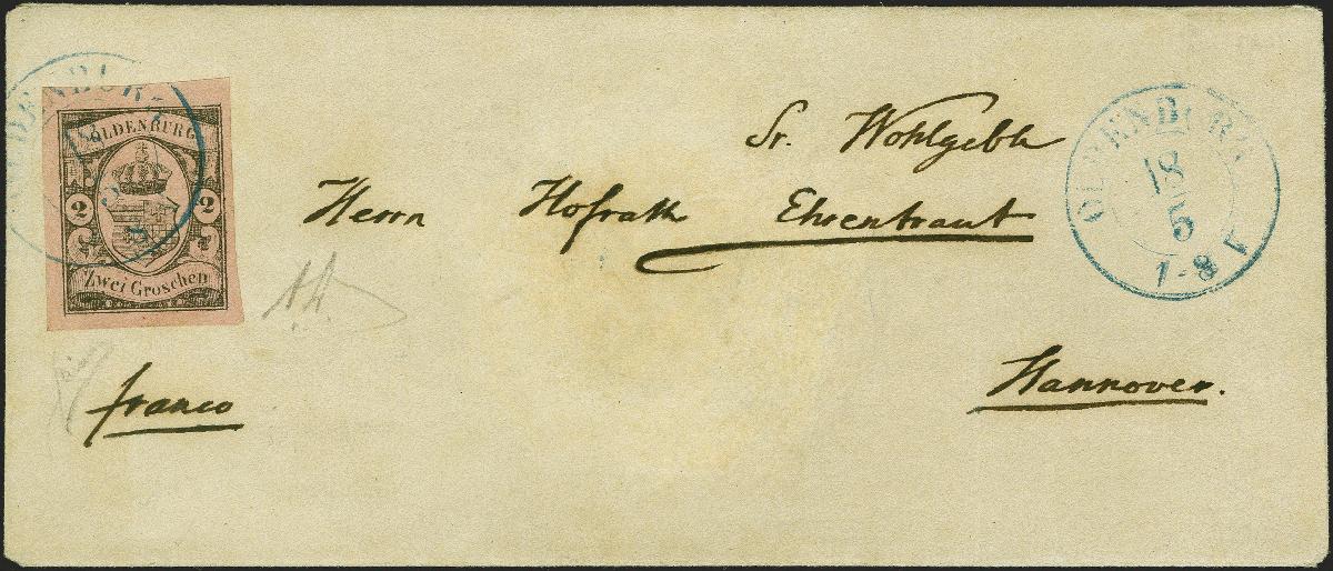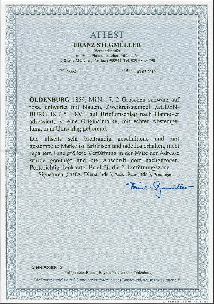 | Zusatzinformationen und Suchstichworte: | 382. Auktion Heinrich Köhler 18. – 23. September 2023 Los 162 2 Groschen schwarz auf rosa, farbfrisch und allseits breitrandig, mit zart auf- und nebengesetztem blauen Doppelkreisstempel "OLDENBURG 18/5" auf kleinem Briefkuvert nach Hannover mit Ankunftsstempel. Eine größere Verfärbung in der Mitte der Adresse wurde gereinigt und die Anschrift dort nachgezogen, sonst einwandfreie und sehr schöne Erhaltung. Mehrfach signiert, Fotoattest Stegmüller BPP (2019) Ausruf 800,00 EUR |