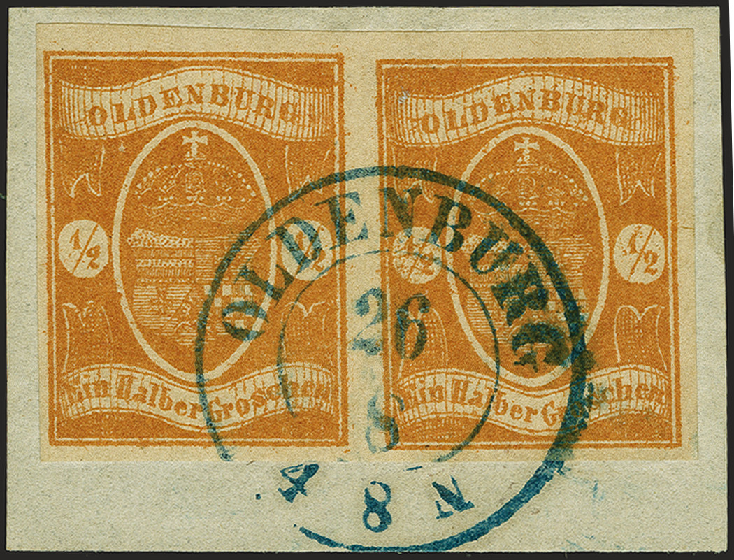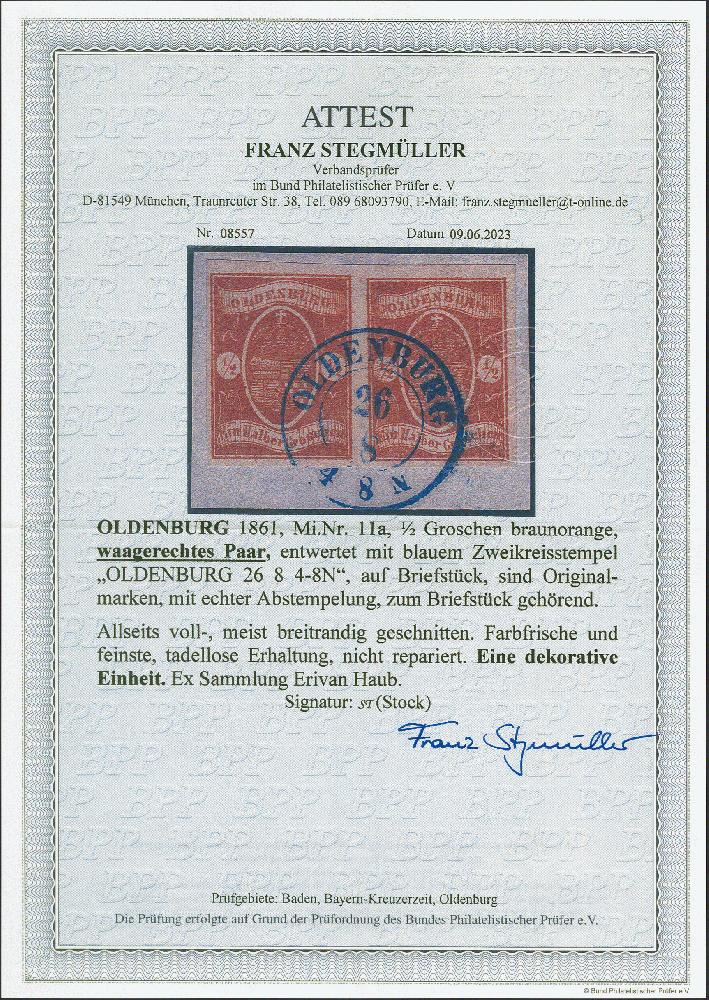 | Zusatzinformationen und Suchstichworte: | 382. Auktion Heinrich Köhler 18. – 23. September 2023 Los 164 ½ Groschen braunorange im waagerechten Paar, farbfrisch und allseits voll- bis meist breitrandig, mit klar und gerade aufgesetztem Doppelkreisstempel "OLDENBURG 26 8", auf Briefstück. Ein besonders schönes Paar in tadelloser Erhaltung. Signiert Stock und Fotoattest Stegmüller BPP (2023) Ausruf 800,00 EUR |