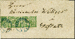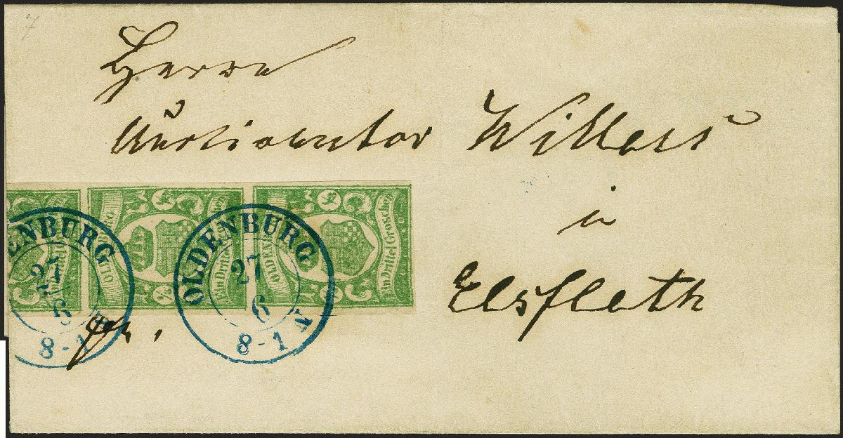 | Zusatzinformationen und Suchstichworte: | 382. Auktion Heinrich Köhler 18. – 23. September 2023 Los 165 ⅓ Groschen bläulichgrün im senkrechten Paar, die obere Marke mit Plattenfehler "Dritto", farbfrisch und allseits voll-bis überrandig, oben mit großem Teil der Nachbarmarke, mit klar aufgesetztem blauem Doppelkreisstempel "OLDENBURG 27 6" auf Briefhülle (eine Klappe unvollständig) nach Elsfleth. Die Frankatur bestand ursprünglich aus einem 3er-Streifen, der aus Platzgründen um den Briefrand geklebt war; bei Öffnung wurde der obere Teil der dritten Marke entfernt. Ein attraktives Paar mit dem seltenen Plattenfehler. Fotoattest Stegmüller BPP (2023) Ausruf 1.000,00 EUR |