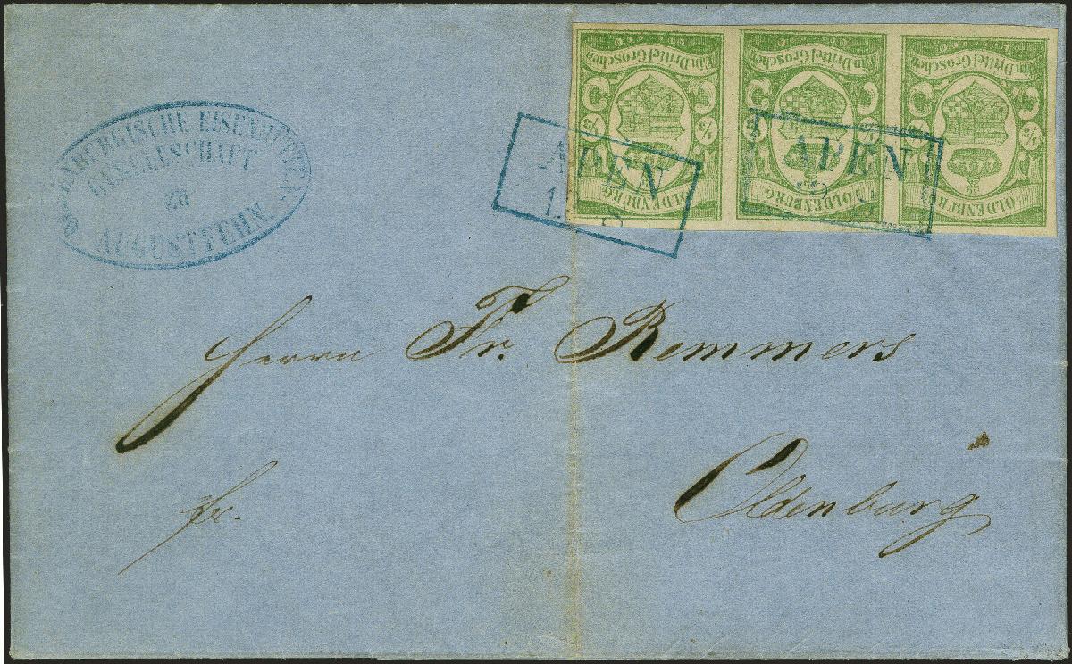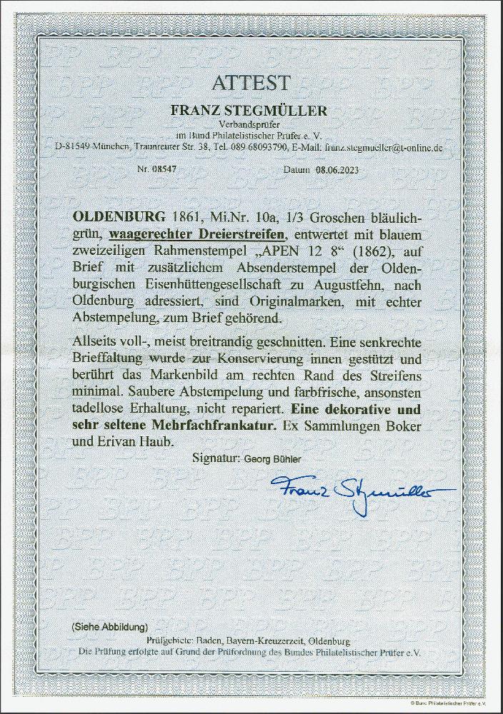 | Zusatzinformationen und Suchstichworte: | 382. Auktion Heinrich Köhler 18. – 23. September 2023 Los 166 ⅓ Groschen bläulichgrün im waagerechten 3er-Streifen, farbfrisch und voll- bis meist breitrandig, mit sauber aufgesetztem blauem Rahmenstempel "APEN 12 8" (1862) auf komplettem Faltbrief der Eisenhütten-Gesellschaft zu Augustfehn nach Oldenburg, mit Ankunftsstempel. Eine senkrechte Falte im Brief wurde zur Konservierung innen gestützt und berührt das Markenbild am rechten Rand des Streifens minimal, sonst einwandfreie und insgesamt frische Erhaltung. Eine sehr seltene Streifen-Frankatur. Signiert Georg Bühler und Fotoattest Stegmüller BPP (2023) Ausruf 6.000,00 EUR |