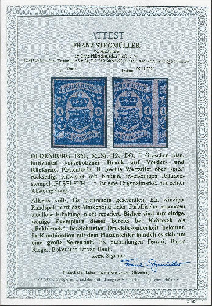 | Zusatzinformationen und Suchstichworte: | 382. Auktion Heinrich Köhler 18. – 23. September 2023 Los 167 1 Gr. blau mit vorder- und rückseitigem Druck (letzterer versetzt gedruckt, mit dem seltenen Plattenfehler "Spitze 1"), voll- bis breitrandig und farbfrisch, leicht und sauber entwertet durch den Rahmenstempel von Elsfleth. Ein winziger Randspalt trifft das Markenbild links, sonst tadellos. Wir haben nur 4 weitere Exemplare dieser Abart registriert. Eine große Seltenheit der Oldenburg-Philatelie. Fotoattest Stegmüller BPP (2021) Ausruf 2.000,00 EUR |