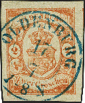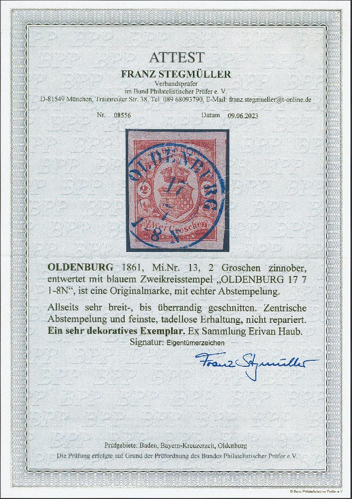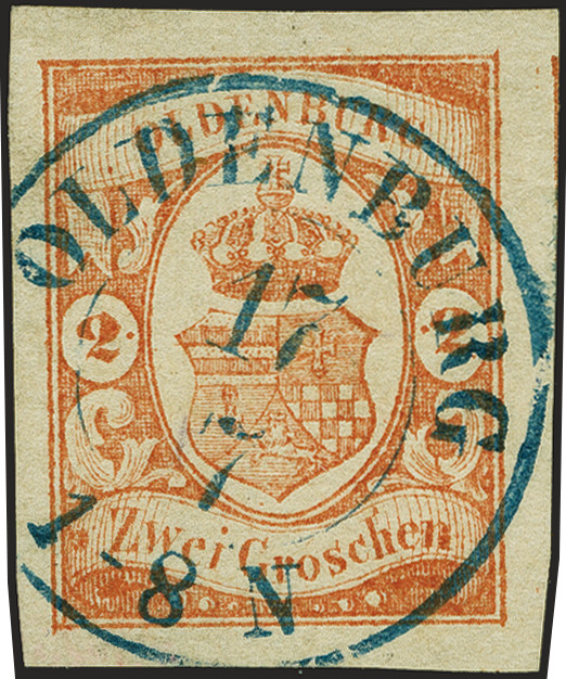 | Zusatzinformationen und Suchstichworte: | 382. Auktion Heinrich Köhler 18. – 23. September 2023 Los 168 2 Groschen zinnoberrot, allseits besonders breitrandig, rechts mit Teil der Nachbarmarken, mit klar und zentrisch aufgesetztem blauen Doppelkreisstempel "OLDENBURG 17 7. Ein besonders schönes Stück in tadelloser Erhaltung. Eigentümerzeichen, Fotoattest Stegmüller BPP (2023) Ausruf 100,00 EUR |