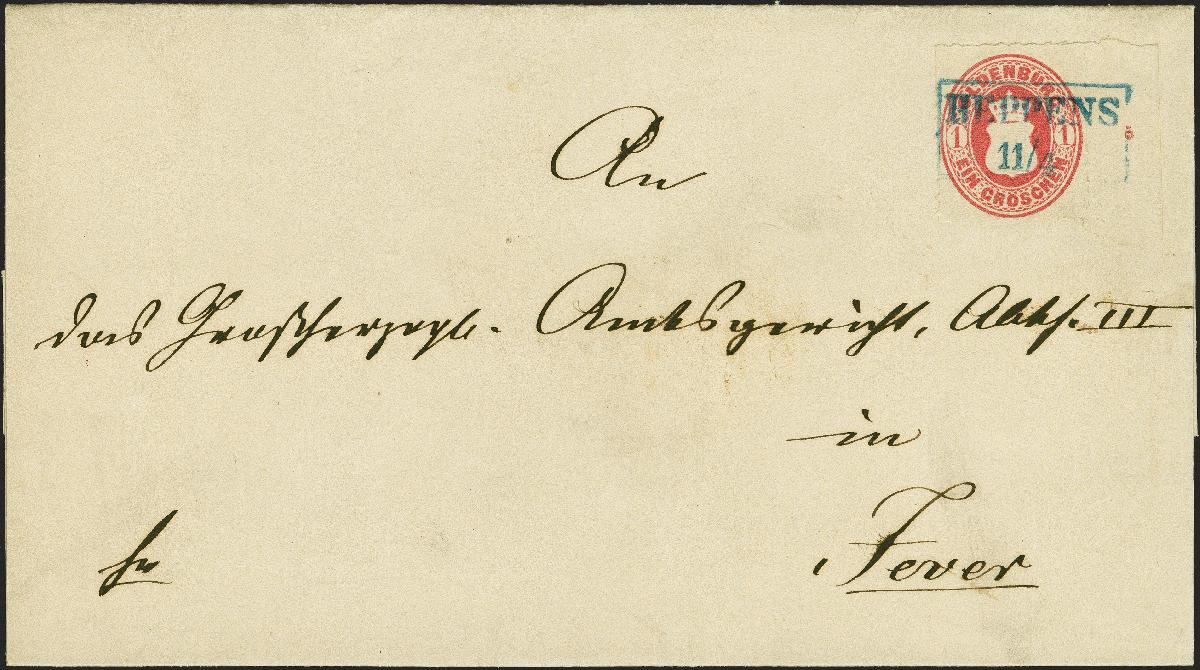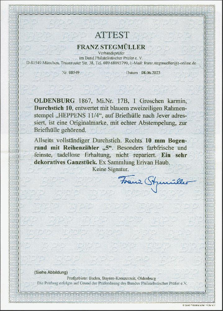 | Zusatzinformationen und Suchstichworte: | 382. Auktion Heinrich Köhler 18. – 23. September 2023 Los 174 1 Groschen karmin, Durchstich 10, farbfrisch und einwandfrei durchstochen, rechts mit 10 mm Bogenrand mit Reihenzähler "5", mit sauber aufgesetztem blauem Rahmenstempel "HEPPENS 11/4" auf Briefhülle nach Jever. Sehr schöne und frische Erhaltung. Randstücke der letzten Ausgabe sind auf Brief sehr selten. Fotoattest Stegmüller BPP (2023) Ausruf 200,00 EUR |