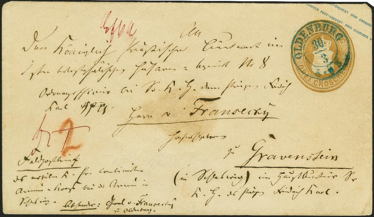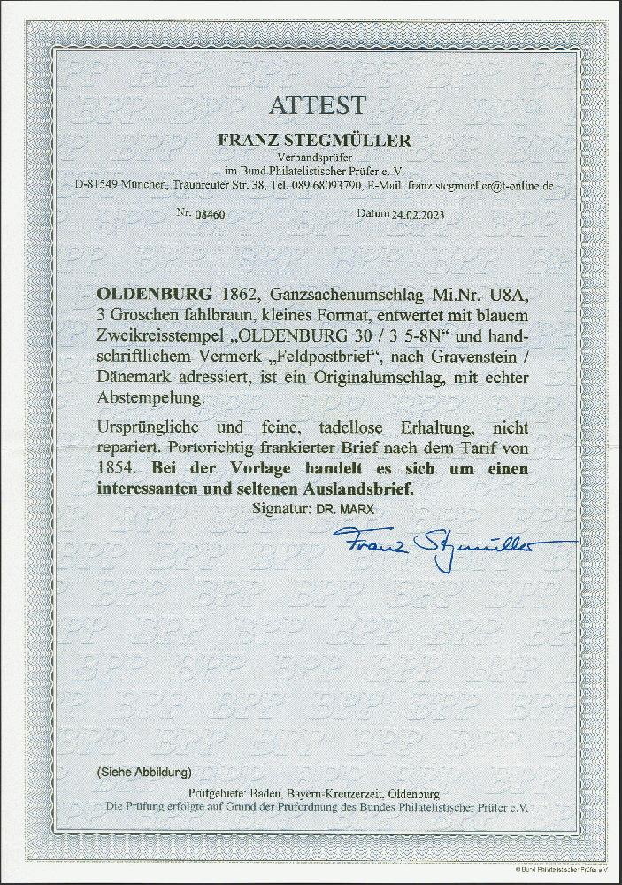 | Zusatzinformationen und Suchstichworte: | 382. Auktion Heinrich Köhler 18. – 23. September 2023 Los 177 1862, Umschlag 3 Silbergroschen fahlbraun im Kleinformat, mit sauber aufgesetztem blauen Doppelkreisstempel "OLDENBURG 30/3" (1864), mit handschriftlichem Vermerk "Feldpostbrief" an den Ordonanz-Offizier des Prinzen Friedrich von Schleswig-Holstein, Herrn von Fransecky, nach Schloss Gravenstein in Schleswig mit rückseitigem Durchgangsstempel des Stadtpostamtes von Hamburg sowie dem aptiertem Stempel des dänischen Postamtes. Ein interessanter und seltener Auslandsbrief während des 2. dänischen Krieges. Signiert Dr. Marx und Fotoattest Stegmüller BPP (2023) Ausruf 500,00 EUR |