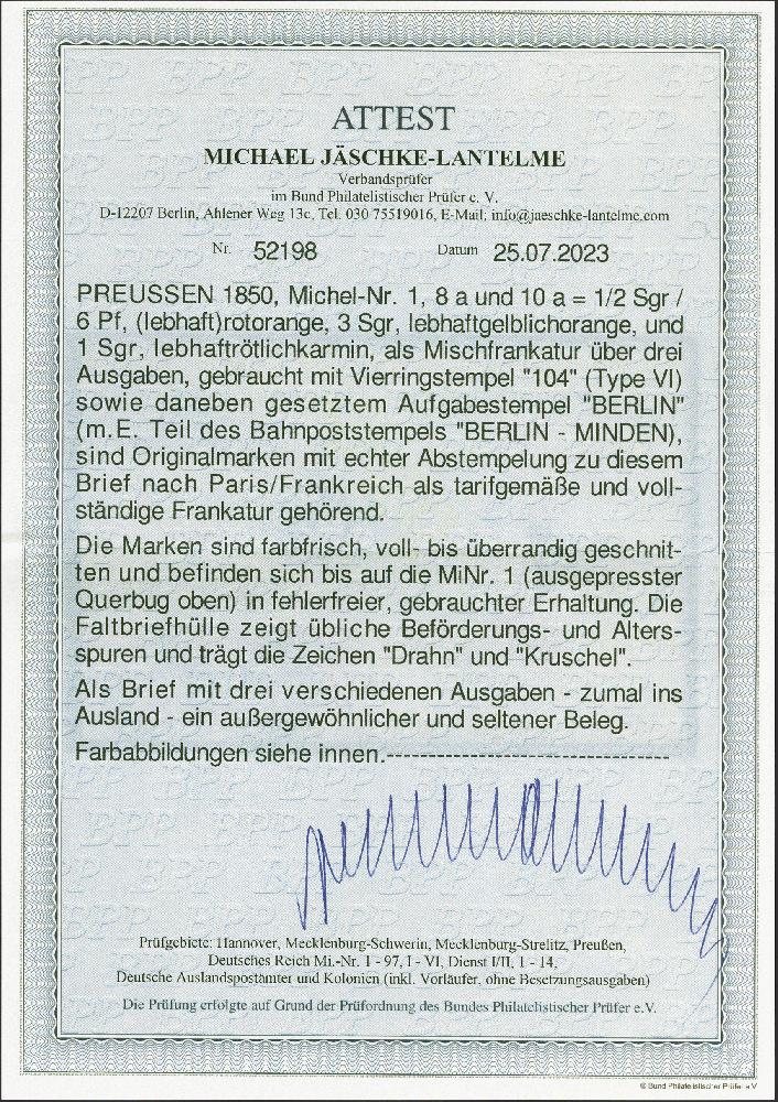 | Zusatzinformationen und Suchstichworte: | 382. Auktion Heinrich Köhler 18. – 23. September 2023 Los 184 ½ Silbergroschen rotorange in Mischfrankatur mit Glatter Grund 3 Silbergroschen lebhaftgelblichorange und Gittergrund 1 Silbergroschen rosa, alle farbfrisch und voll- bis überrandig, mit zweimal sauber aufgesetzter Nr. "104" (Type VI) und nebengesetztem Langstempel "BERLIN" (abgedeckter Bahnpoststempel) auf Briefhülle im Dezember 1858 nach Paris, mit vorder- und rückseitigen Transit- und Ankunftsstempeln. Die ½ Silbergroschen im oberen Bereich durch Briefbug leicht getroffen, sonst einwandfrei. Eine attraktive und seltene Mischfrankatur aller 3 Kopfausgaben. Fotoattest Jäschke-L. BPP (2023) Ausruf 1.000,00 EUR |