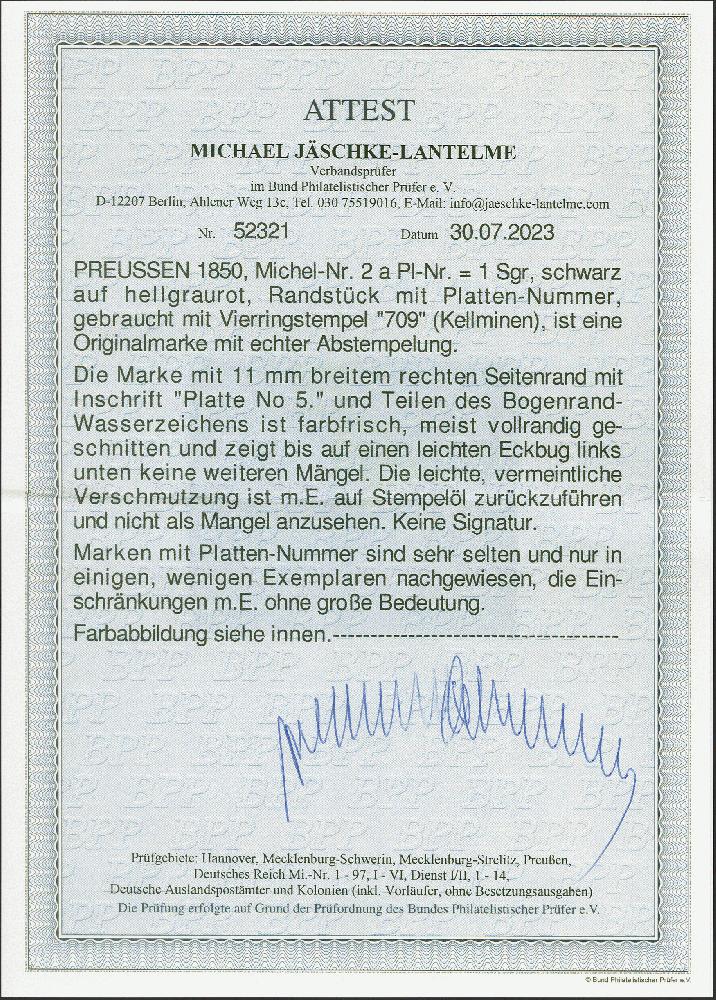 | Zusatzinformationen und Suchstichworte: | 382. Auktion Heinrich Köhler 18. – 23. September 2023 Los 185 1 Silbergroschen schwarz auf hellgraurot, voll- bis breitrandiges rechtes Randstück mit vollständiger Plattennummer "Platte No. 5" sowie Randwasserzeichen "-DER-", zenrisch entwertet durch Nr. "709" KELLMINEN. Links unten unauffälliger kleine Eckbug, sonst einwandfrei. Ein seltenes Stück. Fotoattest Jäschke-L. BPP (2023) Ausruf 500,00 EUR |