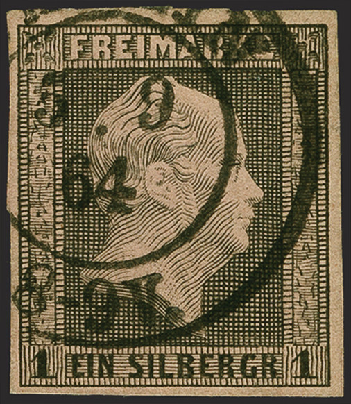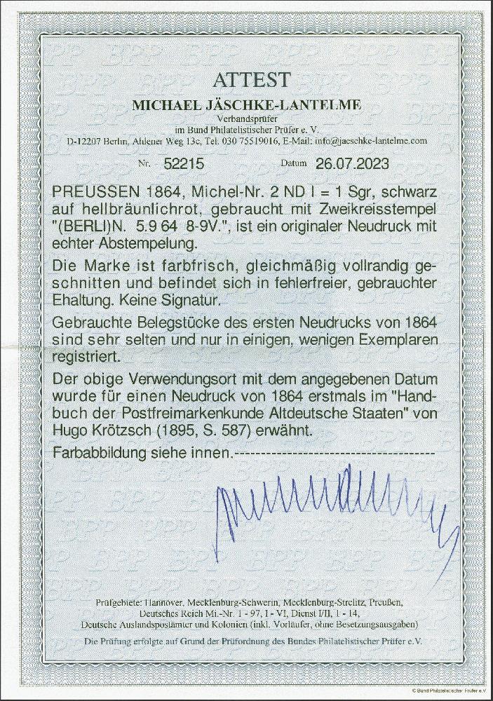 | Zusatzinformationen und Suchstichworte: | 382. Auktion Heinrich Köhler 18. – 23. September 2023 Los 189 Neudrucke 1864: 1 Silbergroschen schwarz auf graurot, farbfrisch und gleichmäßig vollrandig, sauber entwertet durch Doppelkreisstempel "BERLIN 5.9 64", Schöne und tadellose Erhaltung. Die Neudrucke von 1864 sind echt gebraucht sehr selten; von der 1 Silbergroschen haben wir kein weiteres Stück registriert. Fotoattest Jäschke-L. B, PP (2023) Ausruf 500,00 EUR |