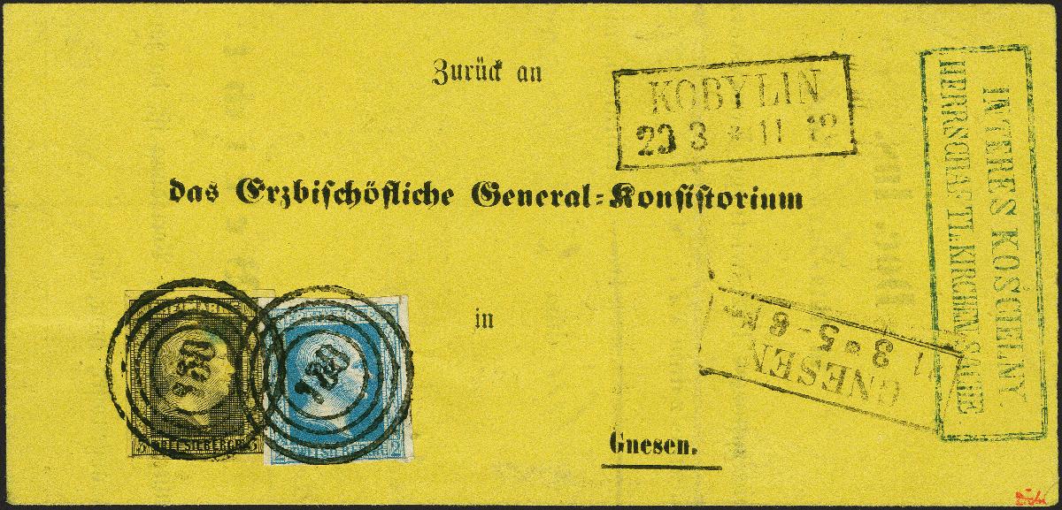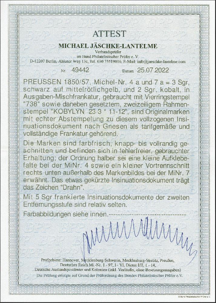 | Zusatzinformationen und Suchstichworte: | 382. Auktion Heinrich Köhler 18. – 23. September 2023 Los 193 3 Silbergroschen schwarz auf gelb in Mischfrankatur mit Glatter Grund 2 Silbergroschen kobalt, beide farbfrisch und voll- bis breitrandig, mit jeweils zentrisch aufgesetzter Nr. "738" und nebengesetztem Rahmenstempel "KOBYLIN 23 3"(1859) auf leuchtendgelbem Insinuations-Dokument mit vorgedruckter Adresse an das erzbischöfliche General-Konsistorium in Gnesen. Ein sehr attraktives Stück in einwandfreier Erhaltung (kleine Aufklebefalte bzw. kleiner Vortrennschnitt außerhalb des Markenbildes ordnungshalber erwähnt). Signiert Drahn und Fotoattest Jäschke-L. BPP (2022) Ausruf 400,00 EUR |