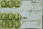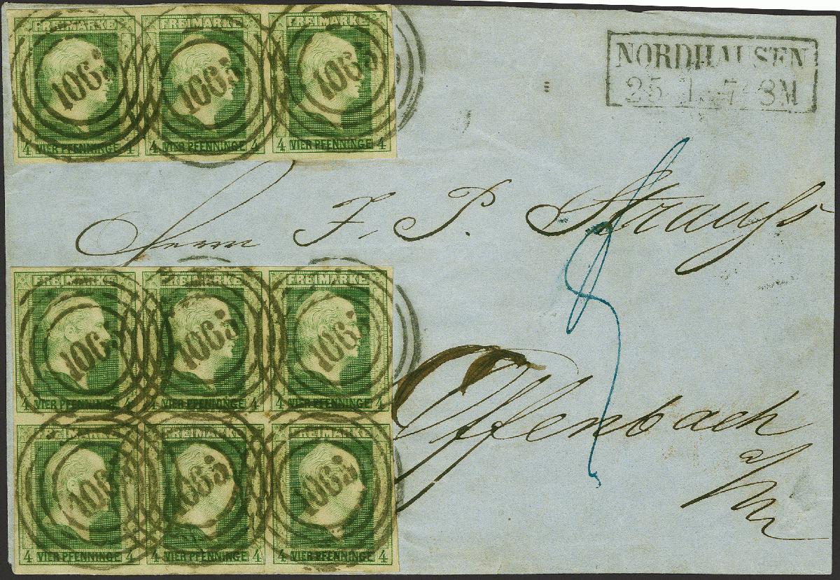 | Zusatzinformationen und Suchstichworte: | 382. Auktion Heinrich Köhler 18. – 23. September 2023 Los 195 4 Pfennige grün, waagerechter 6er-Block und waagerechter 3er-Streifen, frische tiefe Farbe und alle voll- bis meist breitrandig, mit einzeln sauber aufgesetzter Nr. "1065" und sauber nebengesetztem Rahmenstempel "NORDHAUSEN 25 1" auf Briefvorderseite nach Offenbach. Schöne und tadellose Erhaltung (minimale Aufklebefalten). Signiert Friedl, Wien und Kurt Maier, Berlin, Fotoattest Jäschke-L. BPP (2023) Ausruf 2.000,00 EUR |