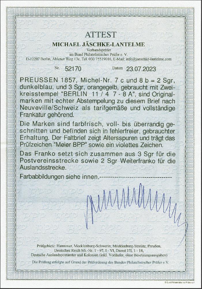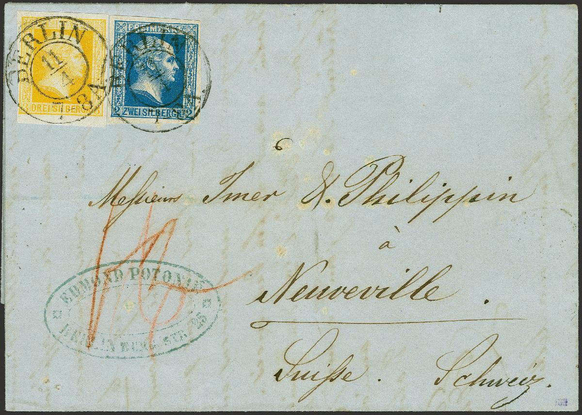 | Zusatzinformationen und Suchstichworte: | 382. Auktion Heinrich Köhler 18. – 23. September 2023 Los 200 Glatter Grund 2 Silbergroschen dunkelblau und 3 Silbergroschen orangegelb, beide farbfrisch und voll- bis meist breitrandig, mit jeweils sauber aufgesetztem ein Doppelkreisstempel "BERLIN 11/4" (1859) auf komplettem Faltbrief nach Neuveville in der Schweiz. Unterdruck minimal hervortretend, sonst tadellos. Ein sehr attraktiver Auslandsbrief 'Glatter Grund'. Signiert Meier BPP und Fotoattest Jäschke-L. BPP (2023) Ausruf 200,00 EUR |