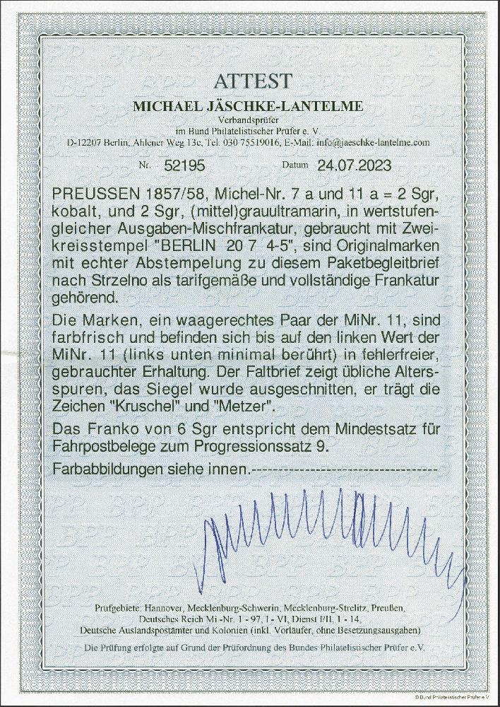 | Zusatzinformationen und Suchstichworte: | 382. Auktion Heinrich Köhler 18. – 23. September 2023 Los 201 Glatter Grund 2 Silbergroschen blau, voll- bis sehr breitrandig, in wertstufengleicher Mischfrankatur mit 2 Silbergroschen grauultramarin, waagerechtes Paar, links unten minimal berührt, sonst ebenfalls voll-bis breitrandig, alle farbfrisch, mit sauber auf- und nebengesetztem Doppelkreisstempel Berlin 20/7 auf Paketbegleitbrief nach Strzelno. Das Briefpapier übliche leichte Altersspuren, sonst einwandfrei. Eine außerordentlich seltene und attraktive Mischfrankatur. Fotoattest Jäschke-L. BPP (2023) Ausruf 2.000,00 EUR |