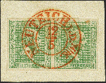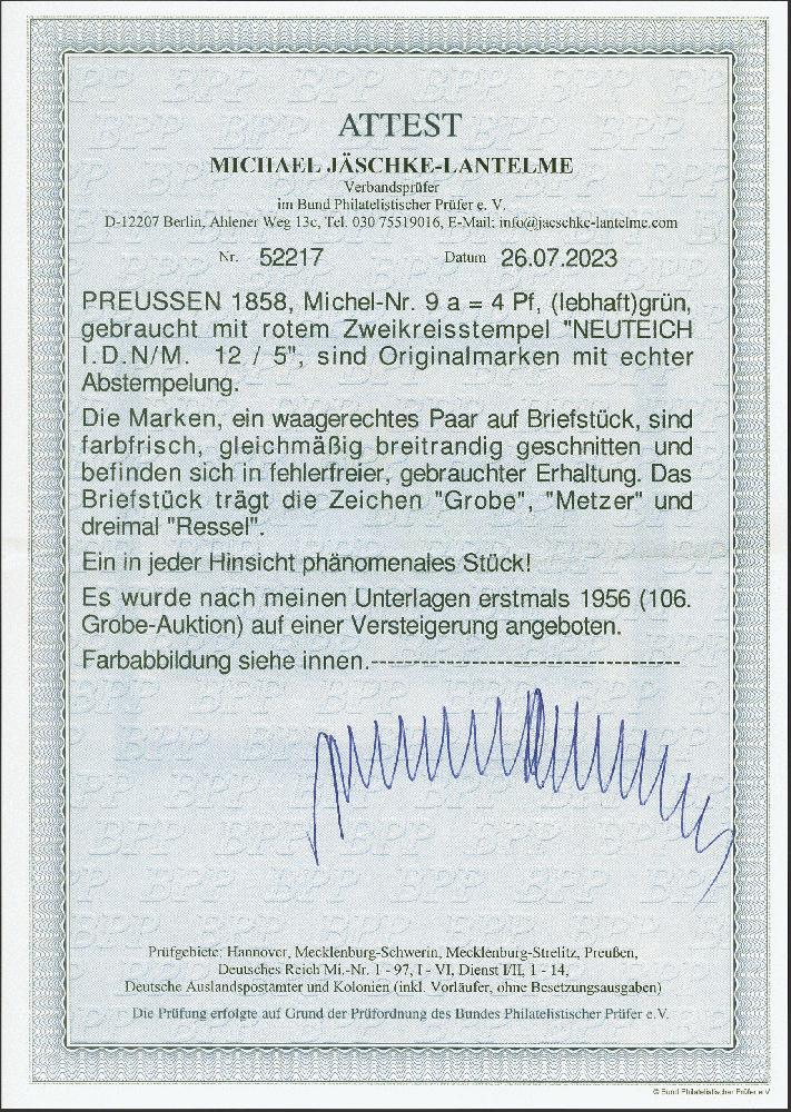 | Zusatzinformationen und Suchstichworte: | 382. Auktion Heinrich Köhler 18. – 23. September 2023 Los 203 4 Pfennige grün, waagerechtes Paar, farbfrisch und allseits breitrandig, mit glasklar zentrisch aufgesetztem roten Doppelkreisstempel "NEUTEICH I. D. N/M." auf Briefstück. Frische und tadellose Erhaltung. Eins der schönsten Stücke der Preußen-Philatelie. Signiert Grobe, Metzer und Ressel, Fotoattest Jäschke-L. BPP (2023) Ausruf 2.000,00 EUR |