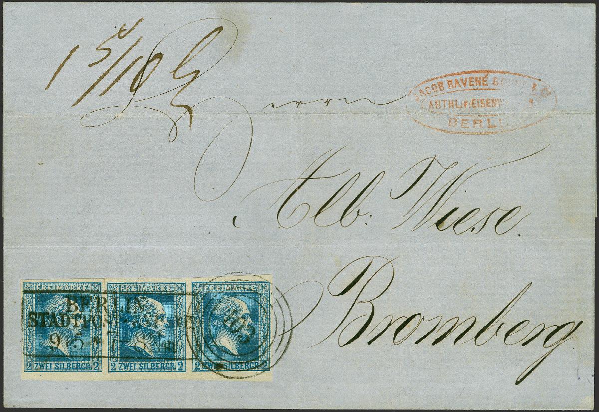 | Zusatzinformationen und Suchstichworte: | 382. Auktion Heinrich Köhler 18. – 23. September 2023 Los 205 2 Silbergroschen grauultramarin im waagerechten 3er-Streifen, dabei die mittlere Marke mit Plattenfehler 'Oberer Balken des F von FREIMARKE oben verkürzt', voll- bis sehr breitrandig und farbfrisch, das linke Paar mit Rahmenstempel „BERLIN/ STADTPOST-EXPED. XII 9/5"(1859), der rechte Wert mit klar aufgesetzter Nr. "103", auf Briefhülle der 2. Gewichtsstufe nach Bromberg. Die 2 Silbergroschen Gittergrund mit Ringstempel ist auf Brief eine Rarität, mit der hier vorliegenden Duplex Entwertung ein besonders attraktives Stück. Fotoattest Jäschke-L. BPP (2023) Ausruf 2.000,00 EUR |