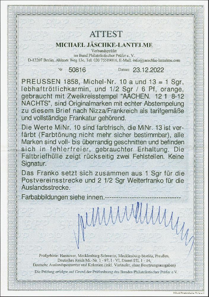 | Zusatzinformationen und Suchstichworte: | 382. Auktion Heinrich Köhler 18. – 23. September 2023 Los 206 1 Silbergroschen karmin, 3 Einzelwerte, zusammen mit ½ Silbergroschen orange, ohne Wasserzeichen, letztere gering verfärbt, sonst alle farbfrisch und voll- bis breitrandig, mit sauber aufgesetztem Doppelkreisstempel "AACHEN 12 1 8-12 NACHTS" auf Briefhülle (rückseitig 2 kleine Fehlstellen) nach Nizza. Ein attraktiver Auslandsbrief. Fotoattest Jäschke-L. BPP (2022) Ausruf 200,00 EUR |