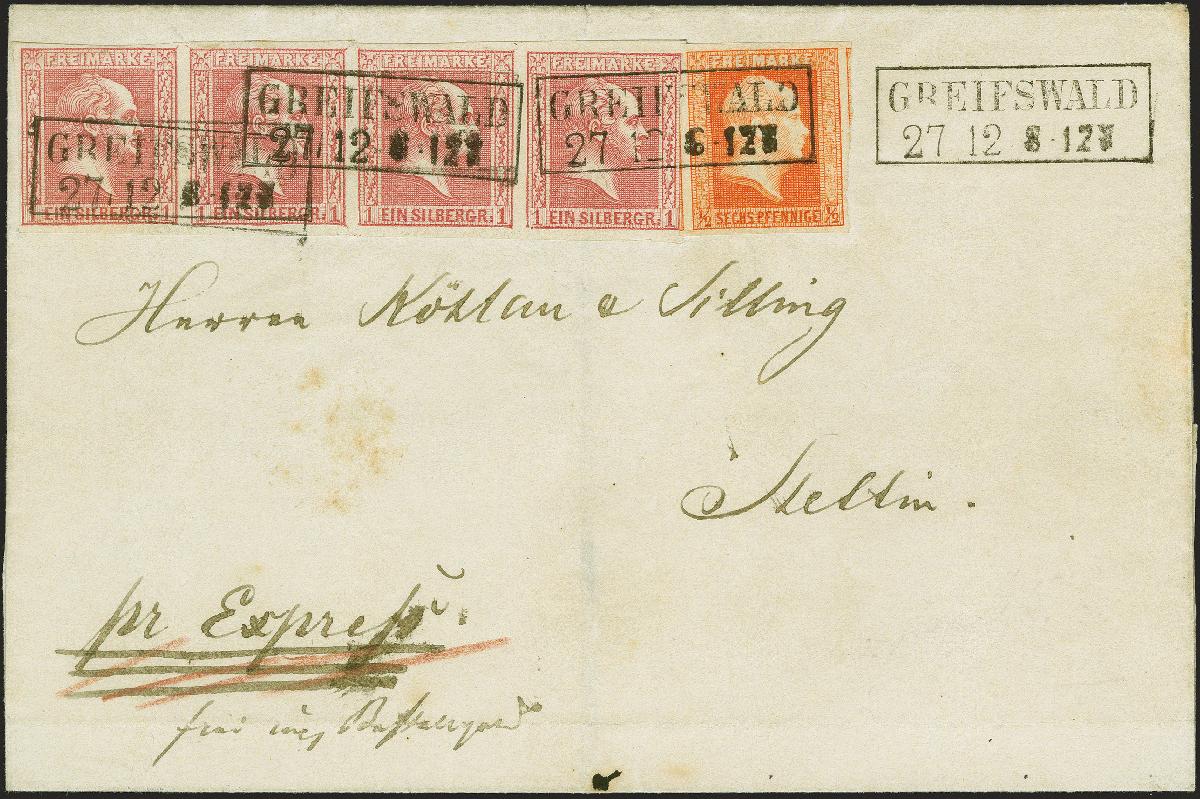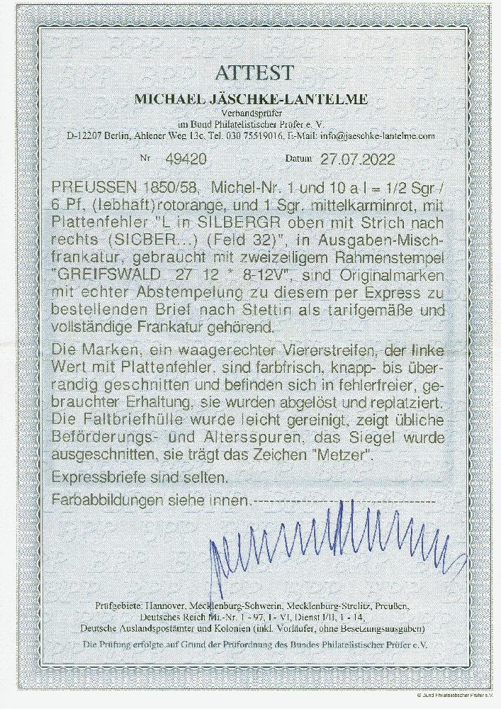 | Zusatzinformationen und Suchstichworte: | 382. Auktion Heinrich Köhler 18. – 23. September 2023 Los 207 1 Silbergroschen karmin im waagerechten 4er-Streifen, dabei die linke Marke mit Plattenfehler "SICBERGR.", In Mischfrankatur mit ½ Silbergroschen orange, mit Wasserzeichen, alle farbfrisch und voll- bis breitrandig, mit sauber aufgesetztem Rahmenstempel "GREIFSWALD 27 12" auf Express-Briefhülle nach Stettin mit Ausgabestempel. Der Brief ist leicht gereinigt, die Frankatur gelöst und replatziert, sonst einwandfrei. Fotoattest Jäschke-L. BPP (2022) Ausruf 200,00 EUR |