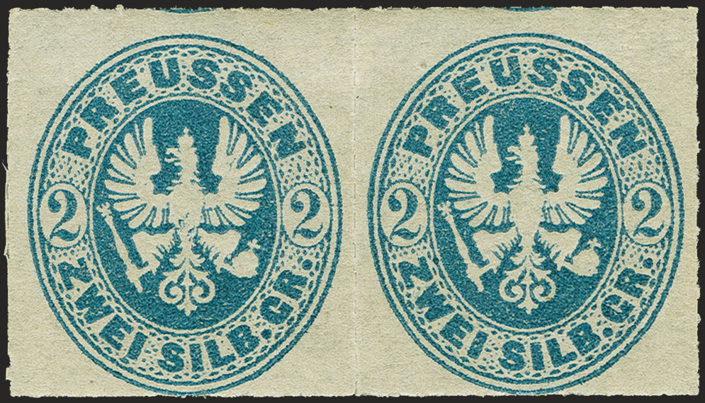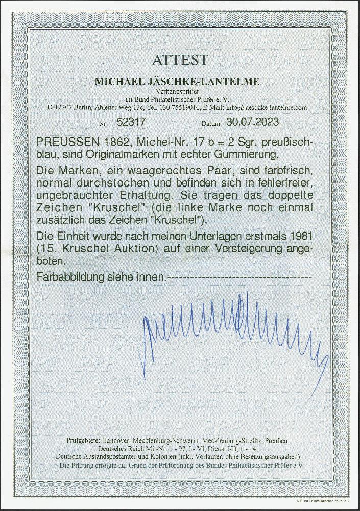 | Zusatzinformationen und Suchstichworte: | 382. Auktion Heinrich Köhler 18. – 23. September 2023 Los 212 2 Silbergroschen preußischblau im waagerechten Paar, farbfrisch und einwandfrei durchstochen, ungebraucht mit Originalgummi. Größte bekannte ungebrauchte Einheit dieser Marke; wir haben nur 2 weitere Paare registriert. Signiert Kruschel, Fotoattest Jäschke-L. BPP (2023) Ausruf 500,00 EUR |