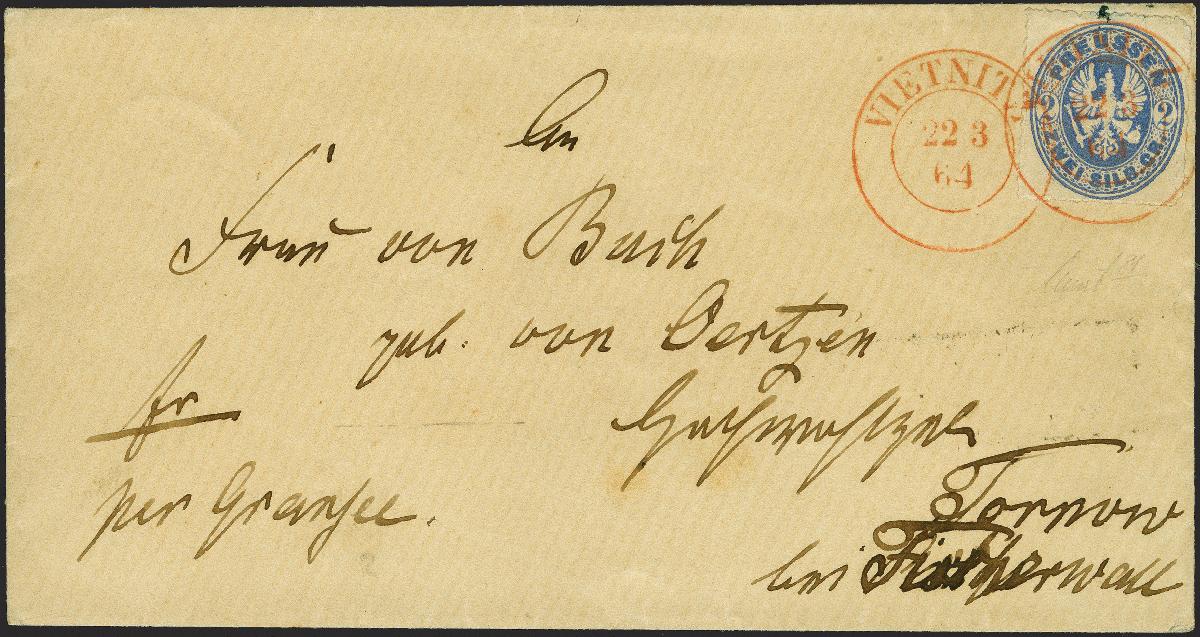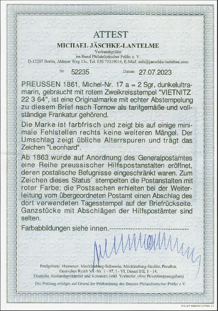 | Zusatzinformationen und Suchstichworte: | 382. Auktion Heinrich Köhler 18. – 23. September 2023 Los 213 2 Silbergroschen ultramarin, farbfrisch und bis auf kleine Durchstichunregelmäßigkeiten rechts gut durchstochen, mit sauber auf- und nebengesetztem roten Doppelkreisstempel "VIETNITZ 22 3 64 auf Briefkuvert nach Tornow. Ein schöner Beleg der preußischen Hilfspostanstalt Signiert Leonhard und Fotoattest Jäschke-L. BPP (2023) Ausruf 500,00 EUR |