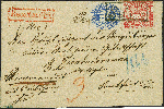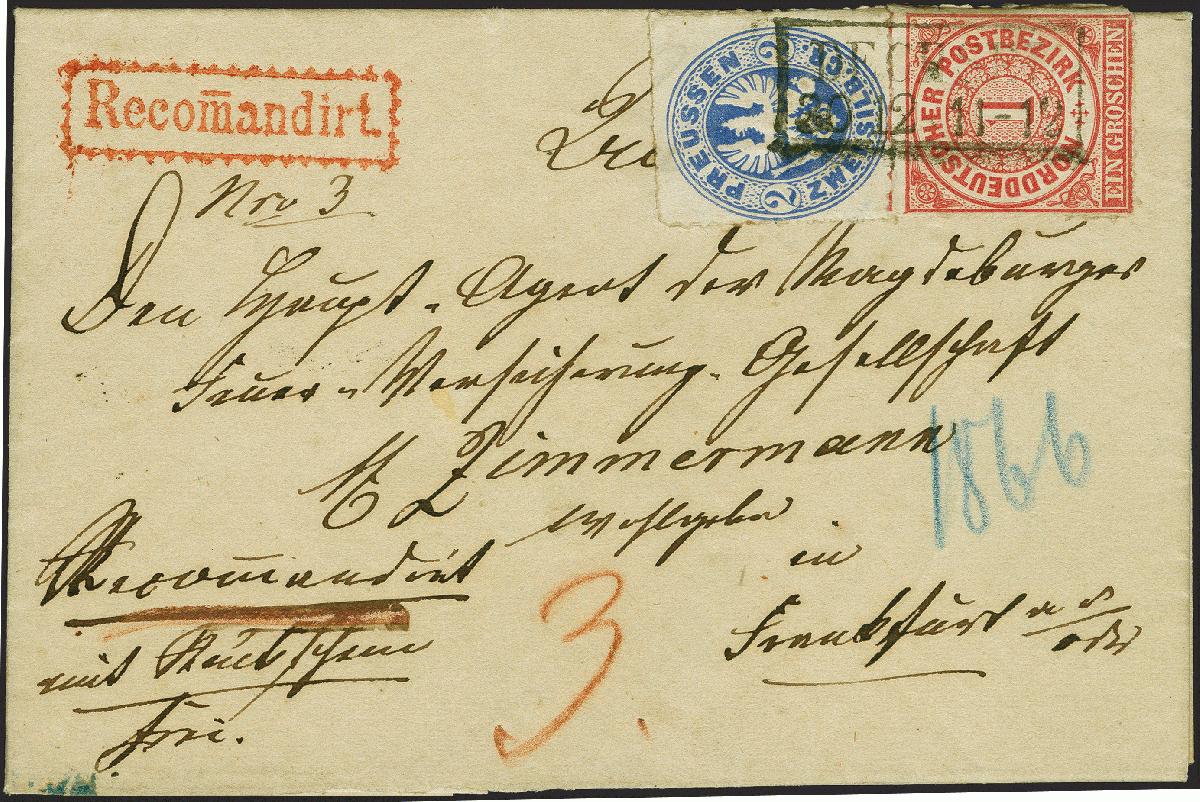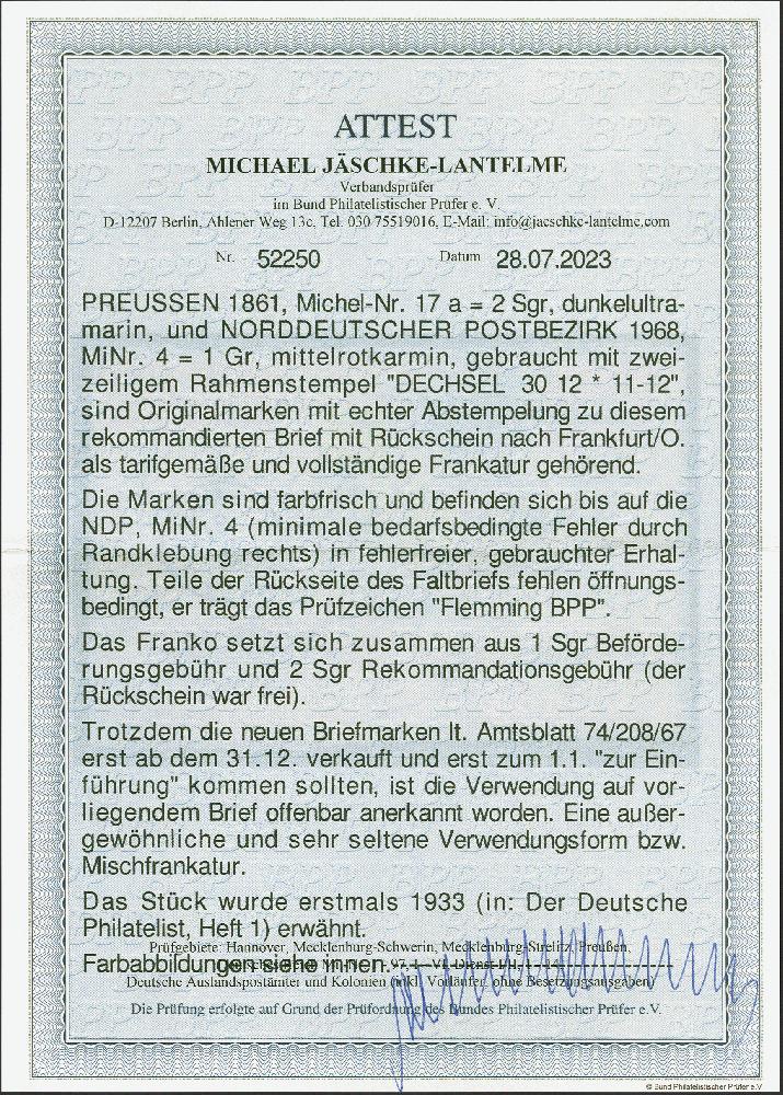 | Zusatzinformationen und Suchstichworte: | 382. Auktion Heinrich Köhler 18. – 23. September 2023 Los 214 2 Silbergroschen ultramarin in Mischfrankatur NDP, 1868, 1 Groschen karmin, beide farbfrisch und meist gut durchstochen, nur die 1 Groschen durch Randklebung etwas bestoßen, mit sauber aufgesetztem Rahmenstempel “DECHSEL 30 12” (1867) auf rückseitig nicht ganz komplettem Reco-Brief "mit Rückschein" (innen datiert 29. Dezember) nach Frankfurt/Oder mit Ausgabestempel vom nächsten Tag. Der Brief ist mit beiden Werten portogerecht frankiert und unbeanstandet befördert. Eine attraktive und außerordentlich seltene Mischfrankatur und ein bemerkenswertes Stück Deutscher Postgeschichte. Fotoattest Jäschke-L. BPP (2023) Ausruf 2.000,00 EUR |
