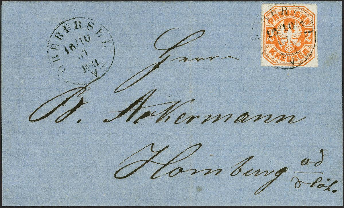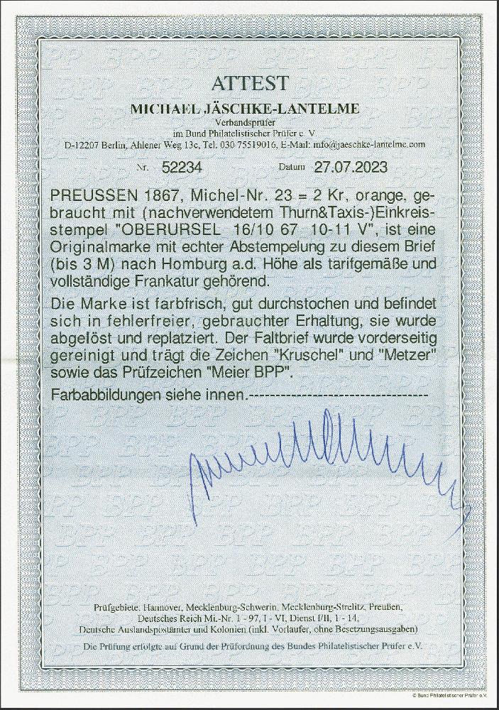 | Zusatzinformationen und Suchstichworte: | 382. Auktion Heinrich Köhler 18. – 23. September 2023 Los 219 2 Kreuzer orange, sehr schön farbfrisch und einwandfrei durchstochen, mit sauber auf- und nebengesetztem Taxis-Einkreisstempel "OBERURSEL 16/10 67" auf Briefhülle nach Homburg. Signiert Kruschel, Metzer und Meier BPP, Fotoattest Jäschke-L. BPP (2023) Ausruf 200,00 EUR |