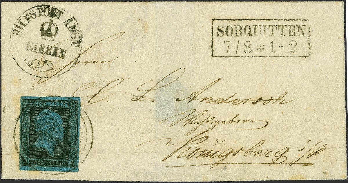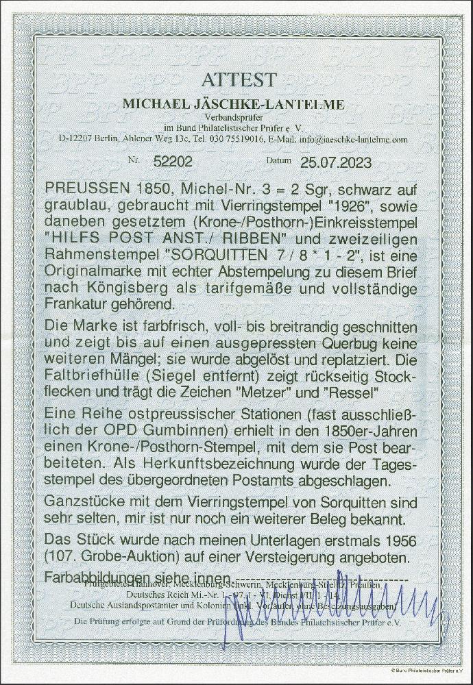 | Zusatzinformationen und Suchstichworte: | 382. Auktion Heinrich Köhler 18. – 23. September 2023 Los 228 "HILFS POST ANST RIBBEN", außerordentlich klar auf kleiner Briefhülle, frankiert mit 1850, 2 Silbergroschen schwarz auf blau, mit zentrischer Nr. "1926" und sauber nebengesetztem Rahmenstempel "SORQUITTEN 7/8" (1857) nach Königsberg. Die Marke war gelöst und ein Bug geglättet, sonst einwandfrei. Es ist nur ein weiteres Ganzstück mit dem Nummernstempel "1926" registriert, mit dem Krone/Posthorn-Stempel von Ribben ein einmaliges Liebhaberstück. Fotoattest Jäschke-L. BPP (2023) Ausruf 5.000,00 EUR |