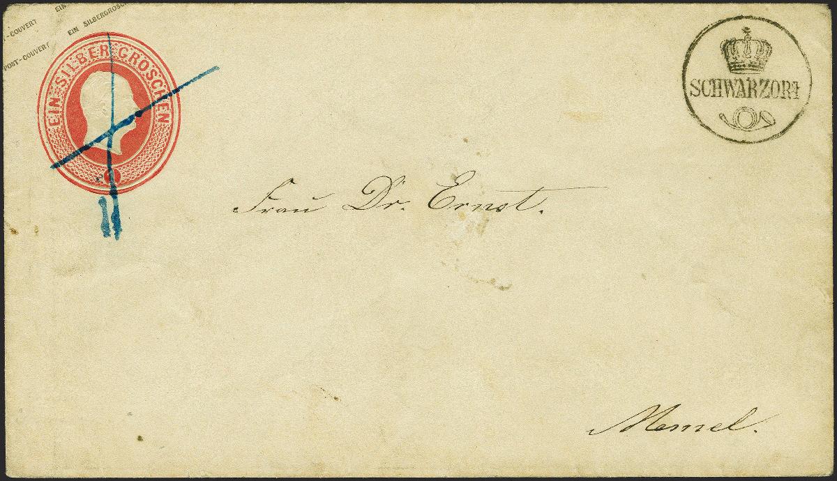 | Zusatzinformationen und Suchstichworte: | 382. Auktion Heinrich Köhler 18. – 23. September 2023 Los 229 "SCHWARZORT", Krone/Posthorn-Stempel, sehr klar auf Umschlag 1 Silbergroschen nach Memel, dabei der Wertstempel mit Federkreuz entwertet, da der Brief innerhalb des Zustellbereichs gelaufen ist. Ein seltenes Stück in einwandfreier Erhaltung. Fotoattest Jäschke-L. BPP (2023) Ausruf 500,00 EUR |