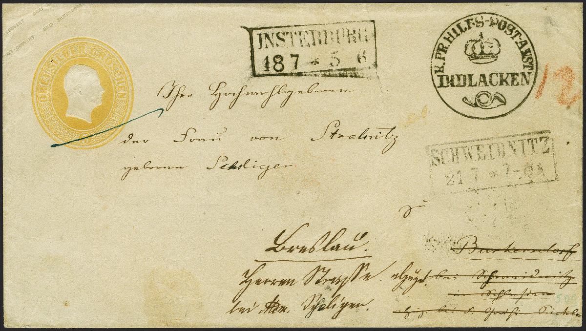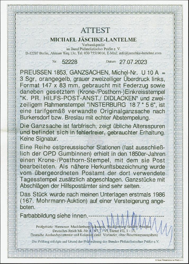 | Zusatzinformationen und Suchstichworte: | 382. Auktion Heinrich Köhler 18. – 23. September 2023 Los 230 "K. PR. HILFS-POST-ANST. DIDLACKEN", prachtvoll klarer Abschlag auf Ganzsachenumschlag 3 Silbergroschen gelb, mit nebengesetztem Rahmenstempel der übergeordneten Postanstalt "INSTERBURG 18 7"nach Schwednitz und nachgesandt nach Breslau. Ein seltenes Stück in schöner Erhaltung. Fotoattest Jäschke-L. BPP (2023) Ausruf 1.000,00 EUR |