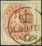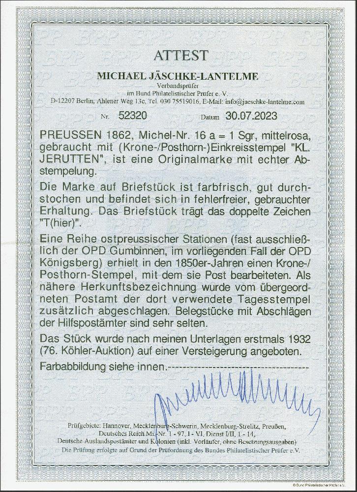 | Zusatzinformationen und Suchstichworte: | 382. Auktion Heinrich Köhler 18. – 23. September 2023 Los 231 "KL. JERUTTEN", klar auf Wappen 1 Silbergroschen rosa, farbfrisch und gut durchstochen, auf kleinem Briefstück. Tadellos. Signiert Thier und Fotoattest Jäschke-L. BPP (2023) Ausruf 500,00 EUR |